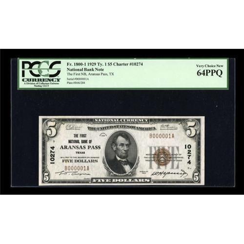 <B>Aransas Pass, TX</B></I> - $5 1929 Ty. 1 <B>The First NB</B></I> Ch. # 10274<BR> A very scarce bank, as six of the eight Series 1929 examples reported from this small coastal community are serial number 1 specimens. Most have long been ensconced in major Texas holdings, with this piece and one other the only such notes offered within the past decade. Fortunately for collectors, this piece is a real beauty, having been graded as <B>Very Choice New 64 PPQ </B></I>by PCGS<BR><BR><b>Shipping:</b> Coins & Currency (<a target="_blank" href="http://www.heritageauctions.com/common/shipping.php">view shipping information</a>)