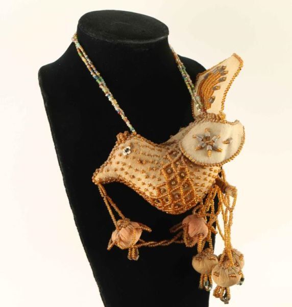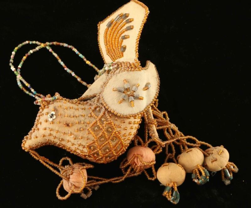 Tan fabric golden beaded bird on perch, back of tail reads '1907' in multicolored beads. Measures 14 1/2" x 6 1/2" with two beaded hanging strings.