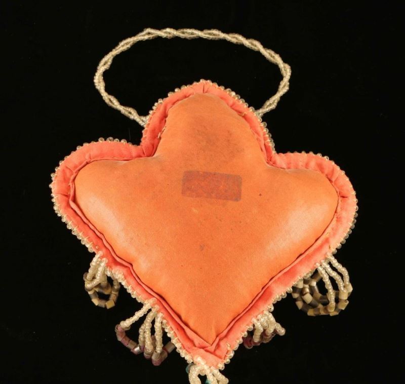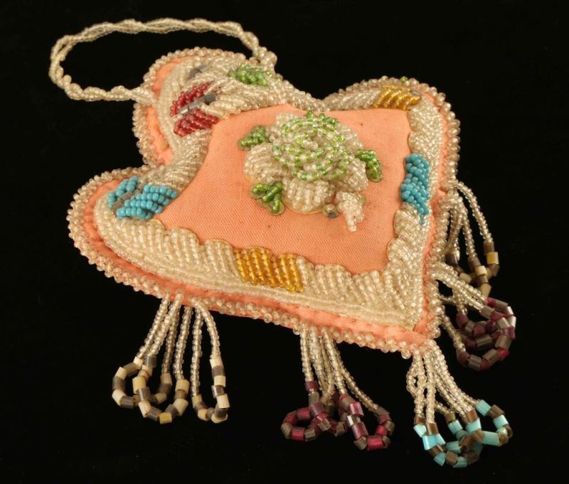 Pink cloth with a beaded floral design and fringe with a beaded string for hanging. Some small stains, otherwise good. 20th century. Heart measures 7"x8".