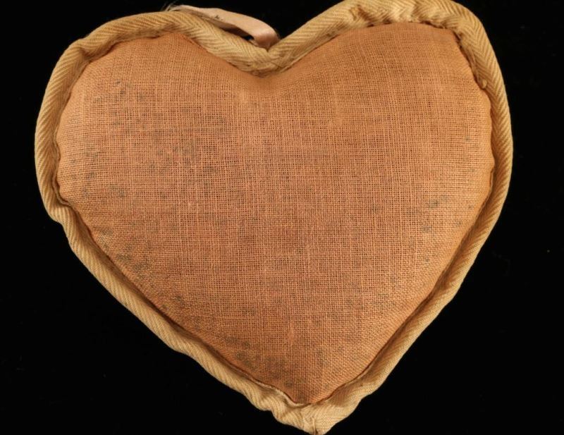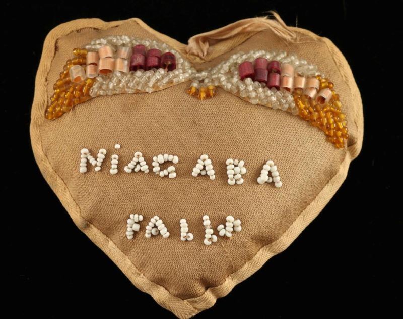 1910 beaded heart shaped whimsy that reads 'Niagara Falls' in white with beaded wings above it. Measures 4 1/2"x4" shows age.