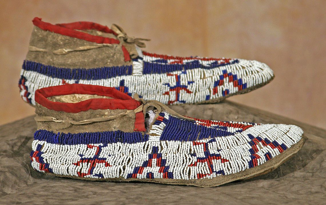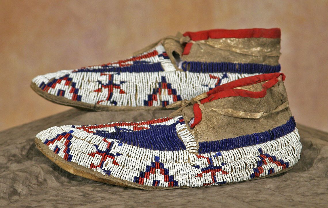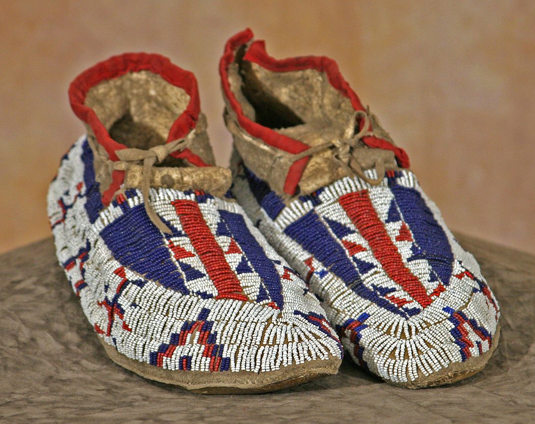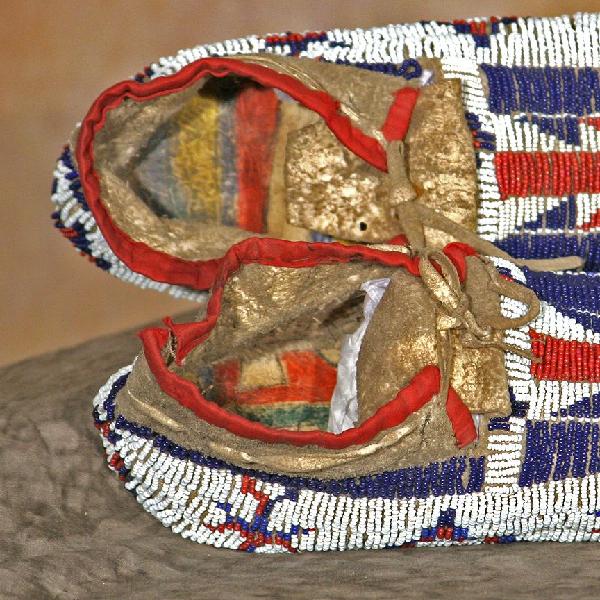 Arapaho Moccasins. 10 ½" long with fully beaded buffalo hide. Beaded in cobalt and white-heart red on a white background. Edged in red cloth. Parfleche sole - painted inside. Sinew sewn beadwork. Circa 1870. (est. $1,500-2,500). CONDITION REPORTS: www.auctioninsantafe.com/docs/cr2012.pdf