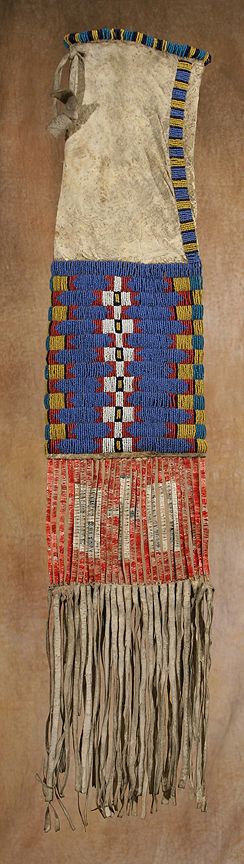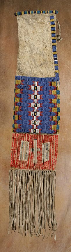 Arapaho Beaded Pipebag. 18" long with 5 ½" of quillwork & 9" of fringe. Lots of great beadwork in typical colors & geometric patterns. Beaded designs continue up each side & around the throat. Circa 1890. (est. $3,000-4,000). CONDITION REPORTS: www.auctioninsantafe.com/docs/cr2012.pdf