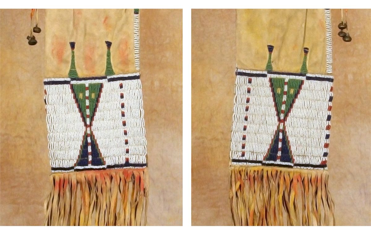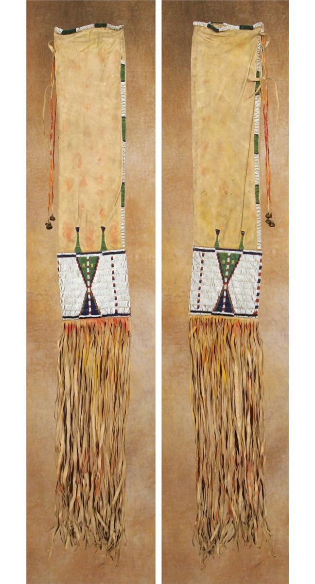 Arapaho Pipebag. 21" x 5" bag, beaded in colors of cobalt, green, yellow and white-heart red on a white background. A single lane of beadwork continues up each edge and around the opening. Three quill-wrapped tassels, finished off with hawk bells, hang from the top. An additional 17" of fringe is attached at the bottom seam. Hide displays red and yellow pigments. 19th century. Provenance: Collection of Dr. Delwin and Karen Bokelman, PA.