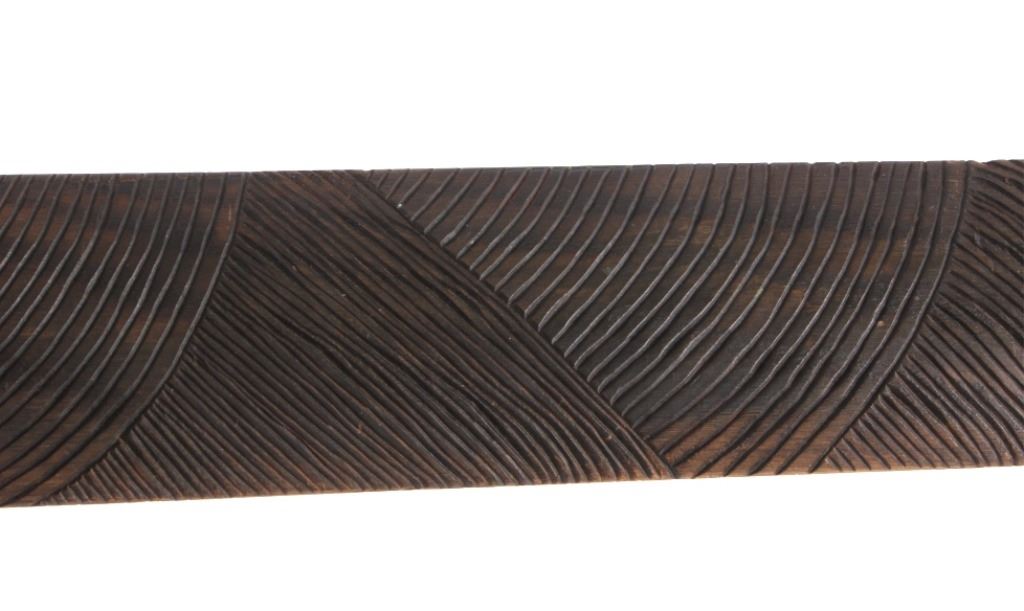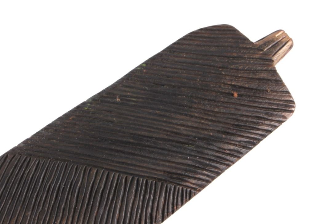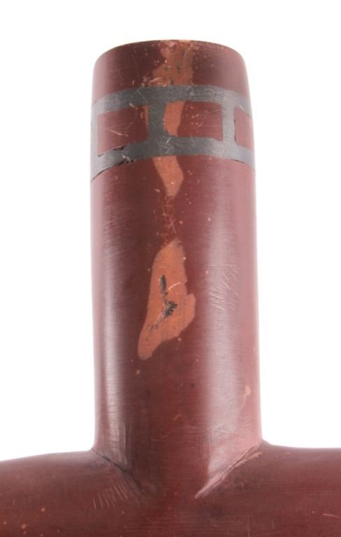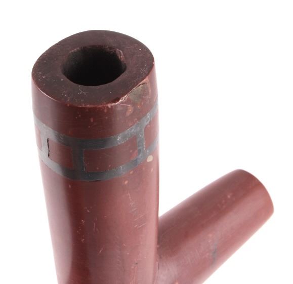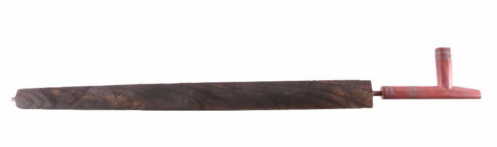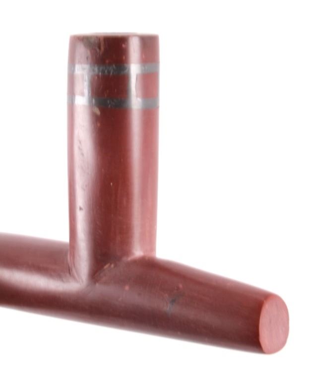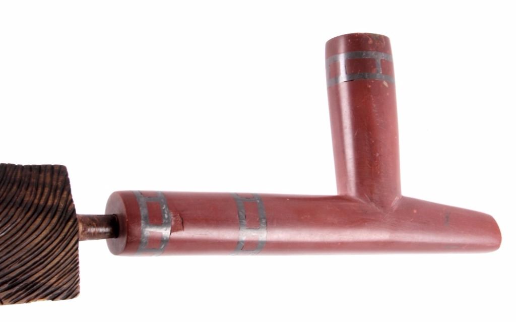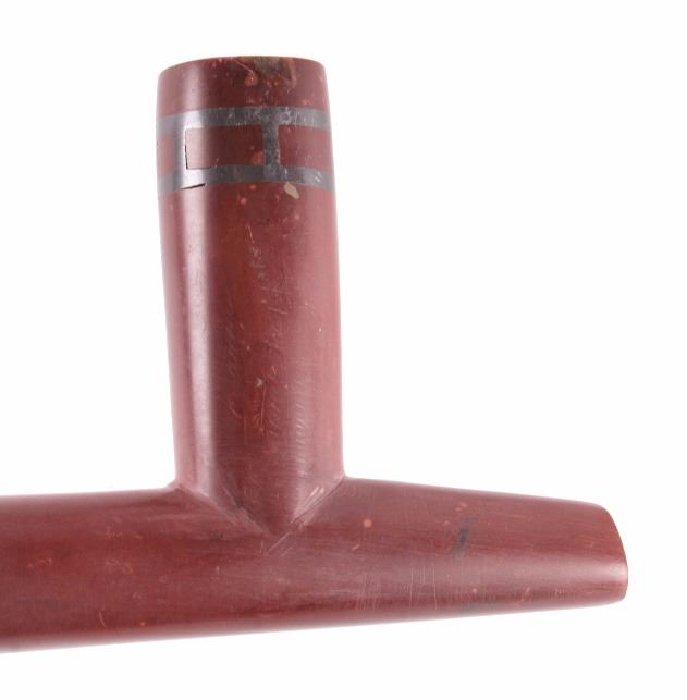 This is an exceptional authentic original Arapaho Native American Indian catlinite pipestone pipe with carved wood stem. The pipe and stem date to circa 1890-1900. The wood stem shows a flat construction with an intricately carved linear pattern on both sides. The stem shows a four-point carved morning star motif. The pipe also features a T-shaped bowl with an overall smooth patina and artful carved form. Provenance: From the personal collection of renowned collector and foremost expert on war clubs and tomahawks, Mark Francis. The Francis collection piece has been authenticated and verified. This is an excellent representation of an early Arapaho piece and the circa late 19th century authentic piece shows exquisite craftsmanship. Truly a museum quality artifact. Exceptional authentic piece. Mark Francis is the author of the renowned publication, "The Mark Francis Collection of American Indian Art (2009)" and "The Missouri War Axe - War Tomahawk of the Plains and Prairies (2010)".