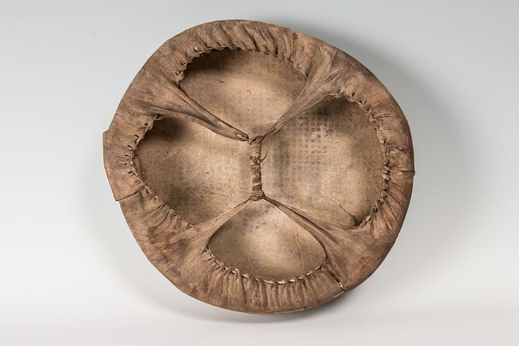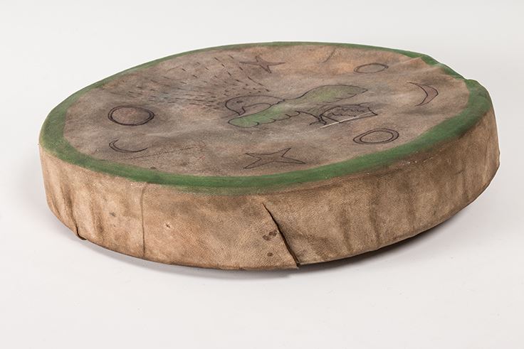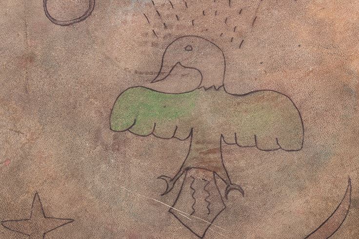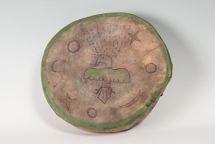 Arapaho Ghost Dance Drum. 15 ½" in diameter at widest point. Features an open back and documented ghost dance symbols painted with black, red, and green pigments. Rare find. Circa 1890.