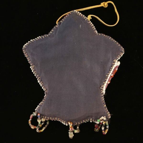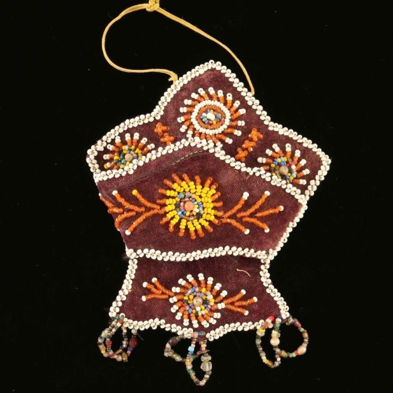 Purple velvet with floral design and beaded dangles in orange, yellow, white, and blue beads. Measures 5 1/4"x4 1/2" with string for hanging. 20th Century design.