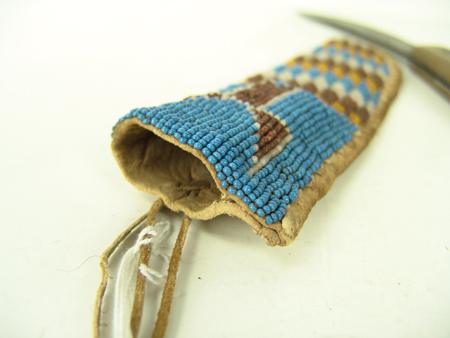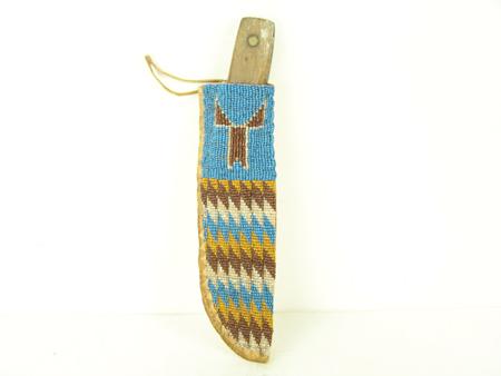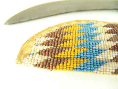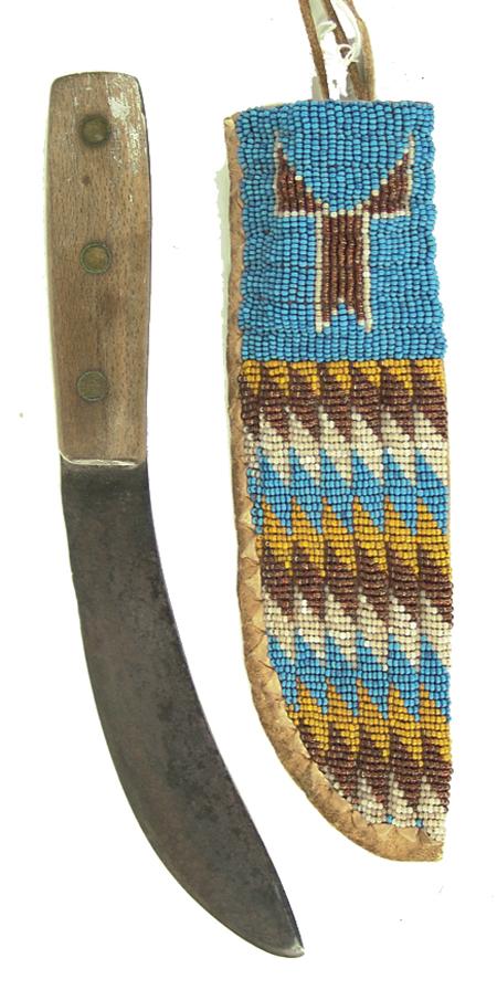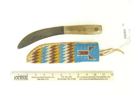 Circa Late 1900s, Classic design lazy stitch beaded rawhide and buckskin sheath with old trapper's knife. Very good condition. 8-1/2" x 2-1/2" + knife