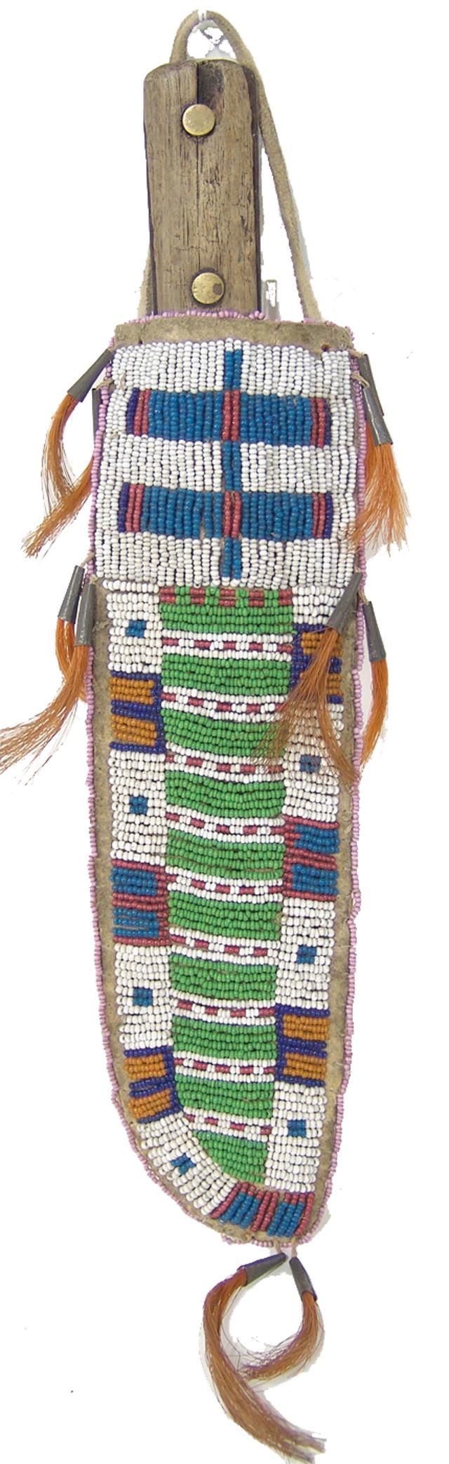 Early/Mid 1900s, The front fully beaded on buffalo hide, the back rawhide, all sinew sewn and with tin cones and dyed horsehair - complete with old trade knife. 12-1/2", knife 10" x 3-1/2"