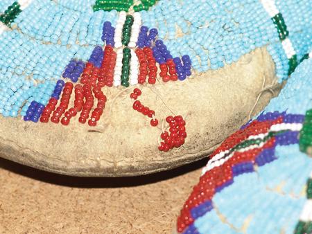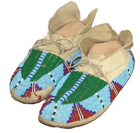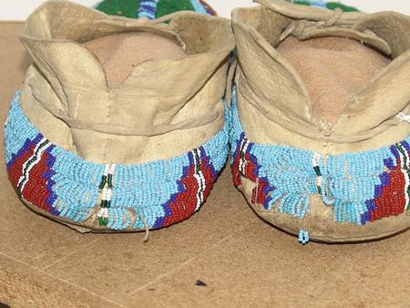 Circa 1970s, Colorful pair of lazy stitch beaded light buckskin moccasins with decorated vamps and sides and with hard rawhide soles. Very good condition with some loose/missing beads. 11-1/2" long From the Johnson Collection.
