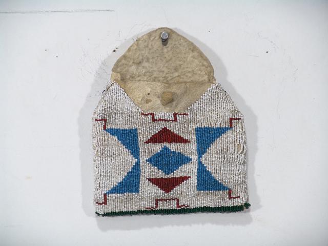 Circa 1890, Fully beaded medicine pouch, sinew sewn on native tanned buckskin; excellent condition. 5-1/2" x 6"