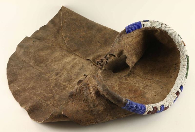 All leather with full beaded trim with blue, white, and red beads. Circa 190-1910. Shows age but in excellent condition for its age.