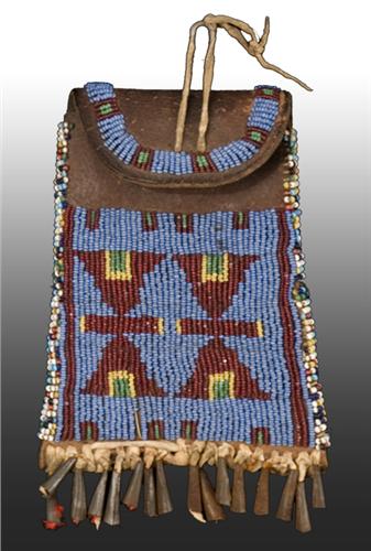 Arapahoe Strike-a-Lite Bag. 4 3/4" x 3 1/2". Fully beaded on harness leather. Tin cone decoration. 19th century. Excellent condition. (est $1,200-1,600)