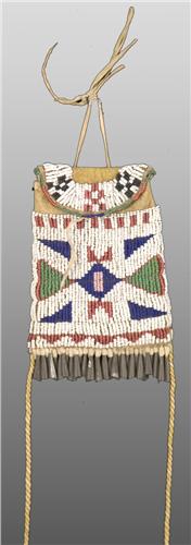 Arapahoe Strike-a-Lite Bag. 5" x 3 1/2". Tin cones decoration. Rawhide back. 19th century. Fine condition. (est $1,600-2,000)