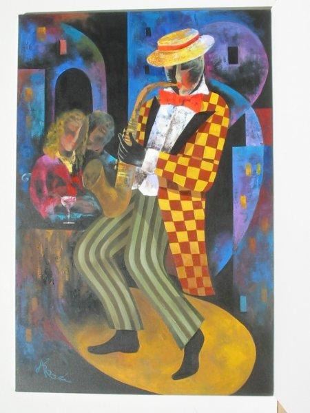 From his Jazz painting series , Arbe executes this colorful and texture saxophone player , getting down with the sound in a cabaret in the french Quarter . The painting is 36x24 oil and mixed-media on linen canvas . The work was previously framed by a fine art Gallery outside New Orleans. It is now unstretched for easy shipping .