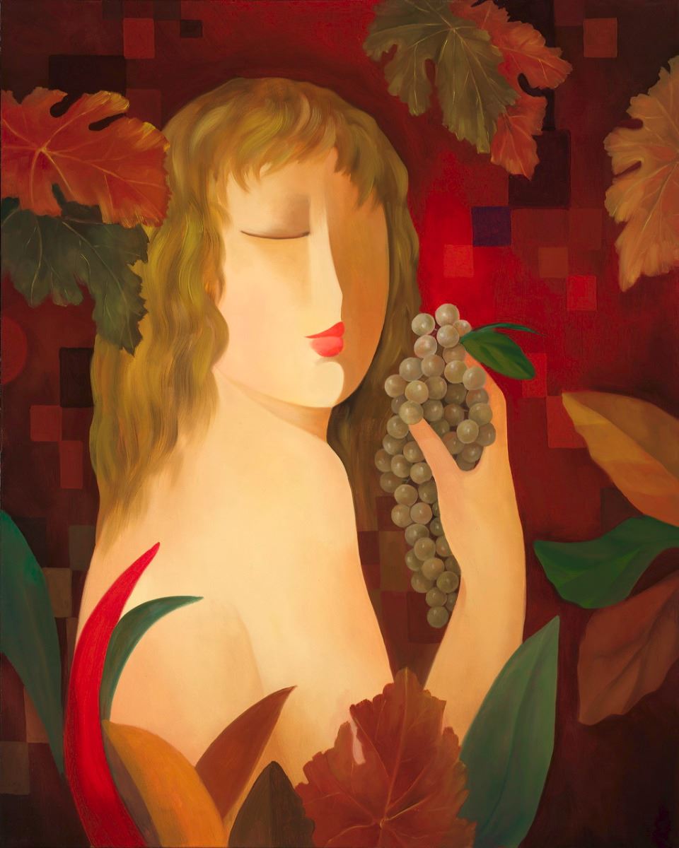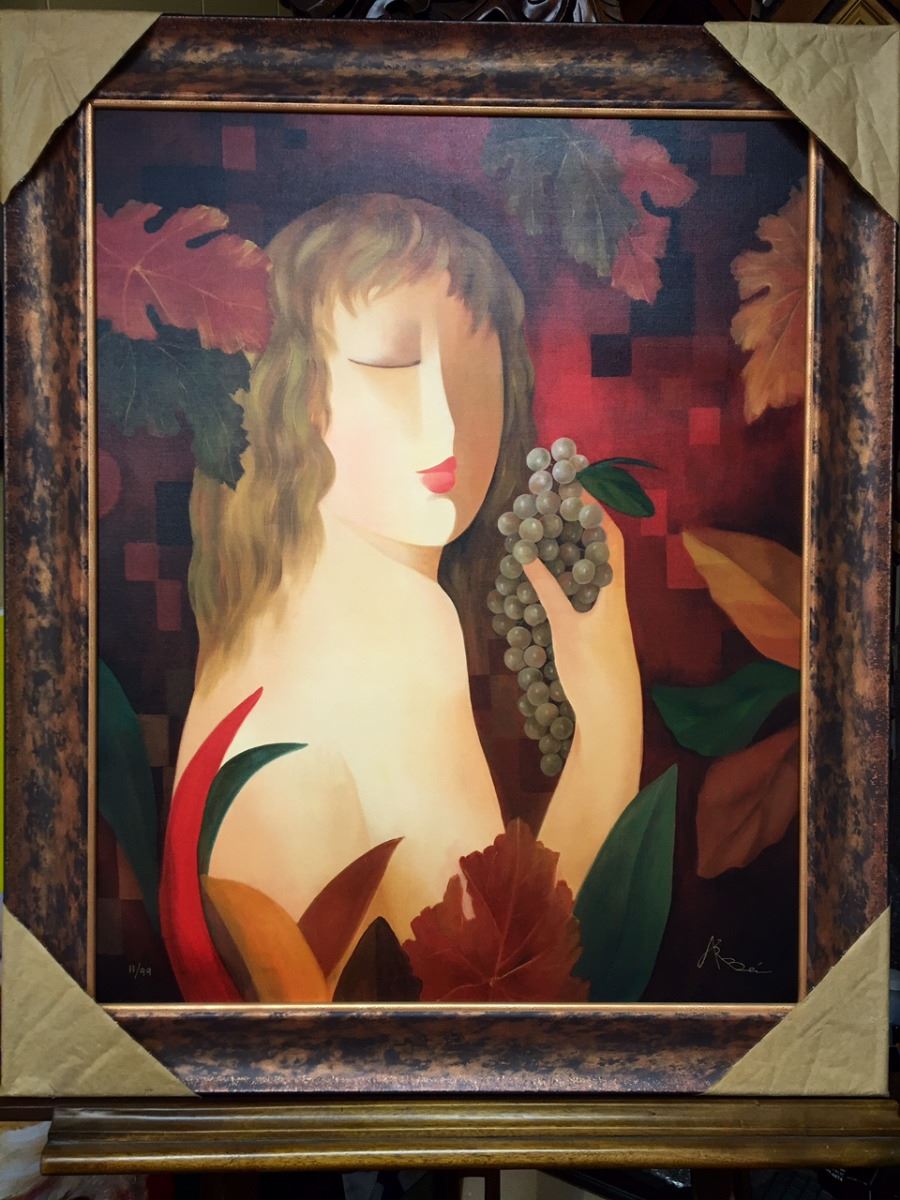 A perfect piece, for art and wine lovers alike. In gorgeous fall colors of red, auburn, burgundy and gold, Arbe captures the mood and the magic of the grape harvest. His lovely female figure represents the Nature and nurture that goes into every aspect of Vineyard life. This piece measures 30x24 and is framed in a complimentary molding that adds to and accents its grandeur.