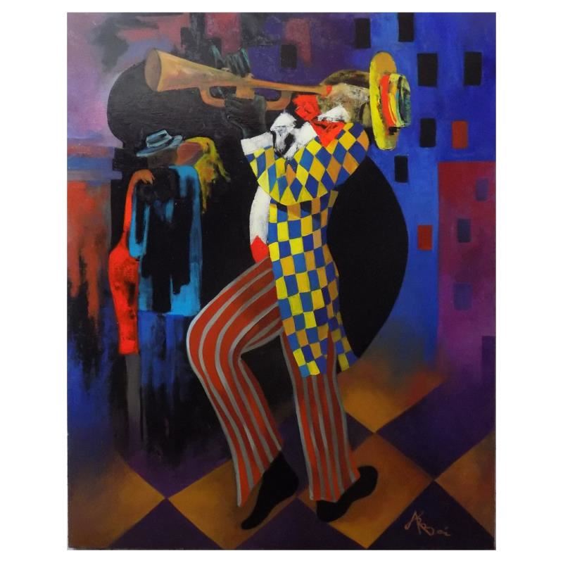 "The Night Is Young" is an original acrylic mixed media painting on canvas by Arbe. The piece is hand signed and comes with a letter of authenticity. Measures approximately 30" x 24".