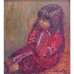 SEATED GIRL IN RED, oil painting on board, 9 x 8", signed lower right, framed. STARTING BID $20. ESTIMATE $20 TO $1000