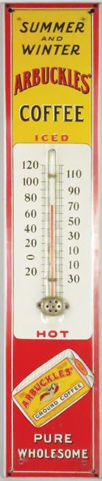 Arbuckles Coffee Beveled Tin Thermometer. A few light scratches otherwise excellent working condition. 3 3/4 X 19 1/4 inches.