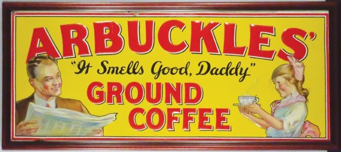 Arbuckles Coffee Embossed Tin Sign. Couple nail holes, scratches and minor rust at top perimeter. 27 X 11 inches image only.