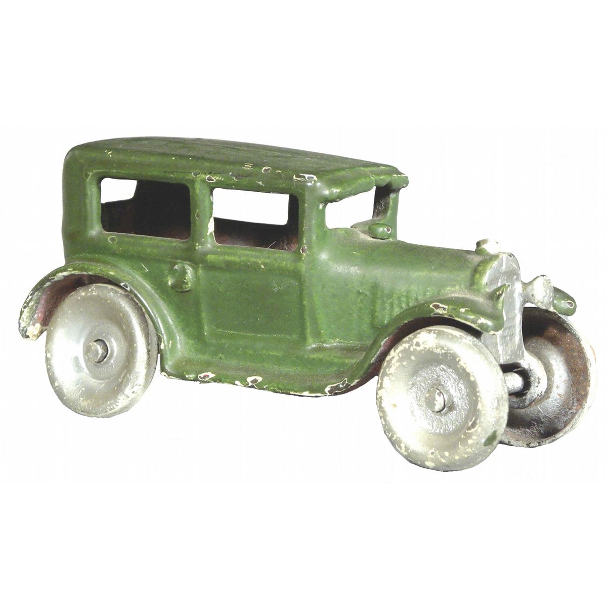 Arcade Cast Iron Toy Sedan. Green w/solid steel silver wheels. 114R marked on underside. Very good condition. 4 inches long.