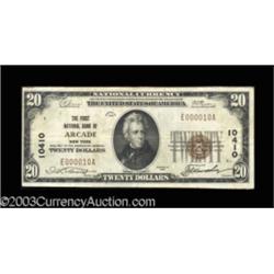 <TABLE cellSpacing=0 cellPadding=0 width="100%" bgColor=#000000 border=0><TBODY> <TR><TD width="100%"><TABLE cellSpacing=1 cellPadding=3 width="100%" border=0><TBODY><TR><TD width="100%" bgColor=#79735c><FONT face=arial color=#ffffff size=3><B>Description</B> </FONT></TD></TR><TR><TD width="100%" bgColor=#ffffff><FONT face=arial size=2><B>Arcade, NY</B></I> - $20 1929 Ty. 1 <B>The First NB</B></I> Ch. # 10410<BR>A rare bank in small size as well as large, with the census skewed due to the existence of two uncut sheets which have not traded in decades. Only four single notes are listed in the new Kelly census, with our records showing the last offering of any kind from this one bank community coming on a 1993 fixed price list. Nice <B>Very Fine.</B></I> (900-1,400 ) </FONT></TD></TR></TBODY></TABLE></TD></TR></TBODY></TABLE><BR><TABLE cellSpacing=0 cellPadding=0 width="100%" bgColor=#000000 border=0><TBODY><TR> Important notice: Heritage usually auctions material at the rate of 200-250 lots per hour. On some occasions eBay Live bid software or the Internet may not be able to keep up with the pace of the auction. We recommend placing a realistic absentee bid now as insurance to avoid disappointment. Occasionally the auctioneer may eliminate or reject an eBay Live bid, and the auctioneer may also reopen a lot after the close of the eBay live bidding (usually because we missed an audience bid), and may reject your bid even if it shows you as the winning bidder. By bidding via eBay Live, you agree that Heritage may award the lot to another bidder at its sole discretion under the circumstances described above or any other reasonable circumstances. Also please note that all Heritage lots purchased through eBay Live carry a 20% Buyer's Premium. Please make sure you read the Terms and Conditions before you bid.</TR></TBODY></TABLE>