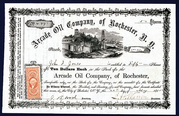 New York, 1865, 50 Shares, Issued Stock, Black print with black ornate border, Oil wells with oil being barreled top center, VF condition.