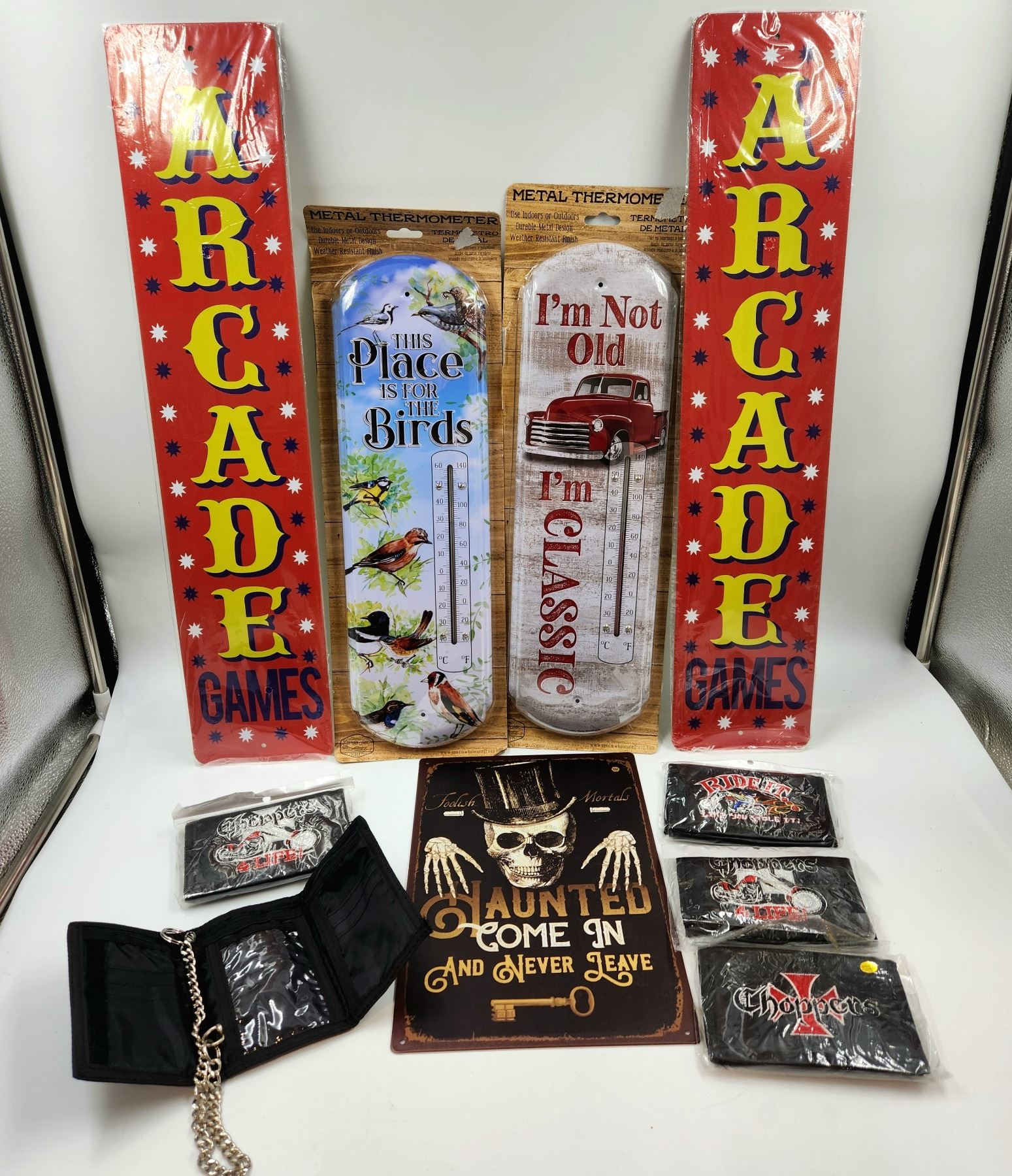 Arcade Signs, Thermometers, Leather Wallets & Haunted Sign