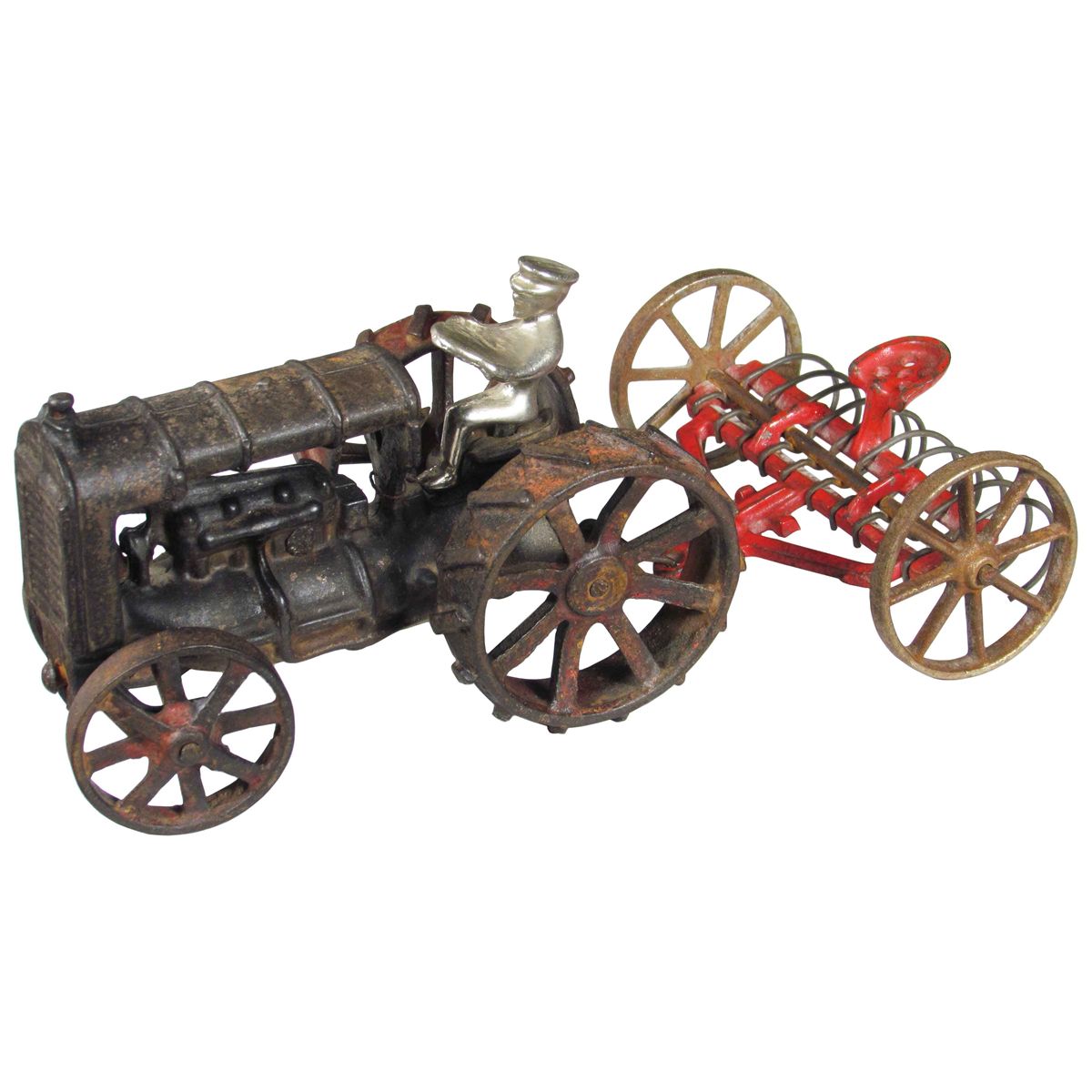 Arcade Toy Co. Cast Iron Tractor and dump rake implement. Most of original paint intact otherwise good condition. 9 inches long.