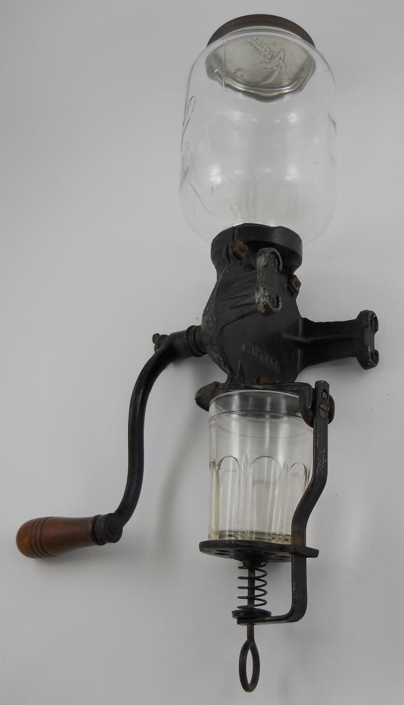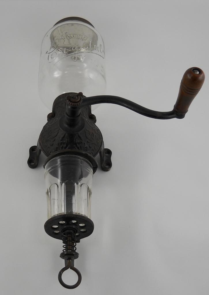 Calling all coffee aficionados! This wall-mounted coffee grinder is 100% original, and you don't find them in this great condition and with all the original parts very often. It's authentic, actually works and is pretty much the best one we have come across. It was produced by Arcade in Freeport, Illinois. It has a cast-iron body with "Arcade" & "Crystal" embossed above the handle. The glass hopper is embossed with "Arcade No 3" and the lid is an original "Arcade" embossed lid that screws on and off easily. The bottom jar is marked "ARCADE MFG CO, FREEPORT ILL". It is 19 inches tall x about 4-½ inches in diameter, and the handle rotates without touching the glass.
