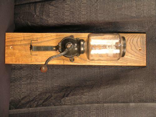 "Arcade" wall mount coffee grinder mounted on an old piece of oak great kitchen item