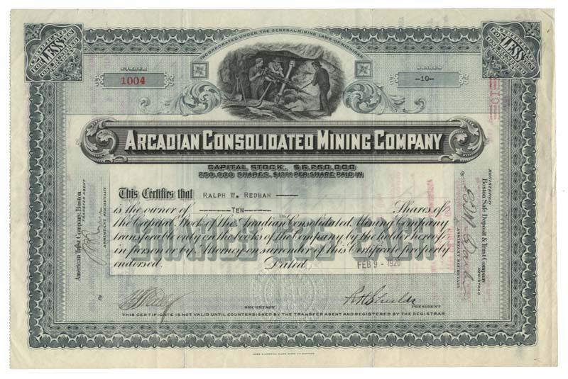 1920, Michigan. Stock certificate for 10 shares. Light blue. Engraved vignette of miners at work. Printed by John A. Lowell Bank Note Co. Boston. Uncancelled and Extremely Fine.