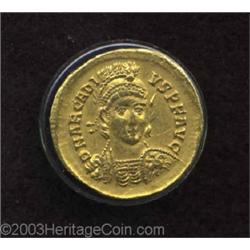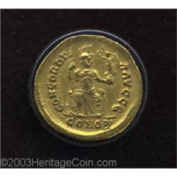<TABLE cellSpacing=0 cellPadding=0 width="100%" bgColor=#000000 border=0><TBODY> <TR><TD width="100%"><TABLE cellSpacing=1 cellPadding=3 width="100%" border=0><TBODY><TR><TD width="100%" bgColor=#79735c><FONT face=arial color=#ffffff size=3><B>Description</B> </FONT></TD></TR><TR><TD width="100%" bgColor=#ffffff><FONT face=arial size=2><B>Arcadius.</B></I> A.D. 383-408. AV solidus (20 mm, 4.43 g). Constantinople, A.D. 397-402. Diademed, helmeted and cuirassed three-quarter bust facing slightly right, holding spear over right shoulder and on left arm shield decorated with a horseman spearing fallen enemy / Constantinopolis enthroned facing, head right, right foot on prow, holding sceptre in right hand, Victory on a globe in left; E/CONOB. RIC 7; Depeyrot 55/1. VF, light scratches in fields. </FONT></TD></TR></TBODY></TABLE></TD></TR></TBODY></TABLE><BR><A name=PricesRealized></A><TABLE cellSpacing=0 cellPadding=0 width="100%" bgColor=#000000 border=0><TBODY><TR><TD width="100%"><TABLE cellSpacing=1 cellPadding=3 width="100%" border=0><TBODY><TR><TD width="100%" bgColor=#79735c><A name=PR><FONT face=arial color=#ffffff size=3><B>Previous Prices from Heritage Auctions</B> </FONT></A></TD></TR><TR><TD bgColor=#f6f6ed>No Prior Data Recorded </TD></TR><TR><TD bgColor=#ffffff><FONT face=arial size=1 ?>PLEASE NOTE: All prices realized reflect the final hammer price PLUS the buyer's premium in auctions that charge a buyer's premium. Each item has a notation at the top of the listing indicating whether that lot included a buyer's premium. Example: A item that sells with a final hammer price of $100 and a 20% buyer's premium will display with a price realized of $120. All information listed is intended to be as accurate as possible, but errors are possible. Please use this guide carefully and inform us of any inaccuracies. </FONT></TD></TR></TBODY></TABLE></TD></TR></TBODY></TABLE><BR><TABLE cellSpacing=0 cellPadding=0 width="100%" bgColor=#000000 border=0><TBODY><TR><TD width="100%"><TABLE cellSpacing=1 cellPadding=3 width="100%" border=0><TBODY><TR><TD width="100%" bgColor=#79735c colSpan=6><FONT face=arial color=#ffffff size=3><B>Price Guide*</B> </FONT></TD></TR><TR bgColor=#f6f6ed><TD align=middle><B>Grade</B> </TD><TD align=middle><B>Coin World<BR>(Trends)</B> </TD><TD align=middle><B>Numismedia<BR>Retail</B> </TD><TD align=middle><B>Numismedia<BR>Wholesale</B> </TD><TD align=middle><B>Coin<BR>Universe</B> </TD><TD align=middle><B>Heritage<BR>Value Index</B> </TD></TR><TR bgColor=#ffffff><TD colSpan=6><FONT size=1>*All information listed is intended to be as accurate as possible, but errors are possible. No item may be returned or refused based on this information which is provided as a service to our customers. You should contact each pricing source directly to determine the accuracy of this information. </FONT></TD></TR></TBODY></TABLE></TD></TR></TBODY></TABLE><BR><TABLE cellSpacing=0 cellPadding=0 width="100%" bgColor=#000000 border=0><TBODY><TR><TD width="100%"><TABLE cellSpacing=1 cellPadding=3 width="100%" border=0><TBODY><TR><TD width="100%" bgColor=#79735c><FONT face=arial color=#ffffff size=3><B>Population Guide</B> </FONT></TD></TR><TR bgColor=#ffffff> Important notice: Heritage usually auctions material at the rate of 200-250 lots per hour. On some occasions eBay Live bid software or the Internet may not be able to keep up with the pace of the auction. We recommend placing a realistic absentee bid now as insurance to avoid disappointment. Occasionally the auctioneer may eliminate or reject an eBay Live bid, and the auctioneer may also reopen a lot after the close of the eBay live bidding (usually because we missed an audience bid), and may reject your bid even if it shows you as the winning bidder. By bidding via eBay Live, you agree that Heritage may award the lot to another bidder at its sole discretion under the circumstances described above or any other reasonable circumstances. Also please note that all Heritage lots purchased through eBay Live carry a 20% Buyer's Premium. Please make sure you read the Terms and Conditions before you bid.</TD></TR></TBODY></TABLE></TD></TR></TBODY></TABLE>