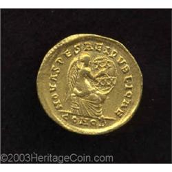 <TABLE cellSpacing=0 cellPadding=0 width="100%" bgColor=#000000 border=0><TBODY> <TR><TD width="100%"><TABLE cellSpacing=1 cellPadding=3 width="100%" border=0><TBODY><TR><TD width="100%" bgColor=#79735c><FONT face=arial color=#ffffff size=3><B>Description</B> </FONT></TD></TR><TR><TD width="100%" bgColor=#ffffff><FONT face=arial size=2><B>Arcadius.</B></I> A.D. 383-408. AV solidus (20 mm, 4.27 g). Constantinople, A.D. 402. Diademed, helmeted and cuirassed three-quarter bust facing slightly right, holding spear over right shoulder and on left arm shield decorated with a horseman spearing fallen enemy / NOVA SPES REIPVBLICAE, Victory seated left on cuirass, supporting on her left knee shield inscribed XX/XXX in two lines to which she points; CONOB. RIC 23; Depeyrot 54/1. Fine, ex jewelry. Rare one year type. </FONT></TD></TR></TBODY></TABLE></TD></TR></TBODY></TABLE><BR><A name=PricesRealized></A><TABLE cellSpacing=0 cellPadding=0 width="100%" bgColor=#000000 border=0><TBODY><TR><TD width="100%"><TABLE cellSpacing=1 cellPadding=3 width="100%" border=0><TBODY><TR><TD width="100%" bgColor=#79735c><A name=PR><FONT face=arial color=#ffffff size=3><B>Previous Prices from Heritage Auctions</B> </FONT></A></TD></TR><TR><TD bgColor=#f6f6ed>No Prior Data Recorded </TD></TR><TR><TD bgColor=#ffffff><FONT face=arial size=1 ?>PLEASE NOTE: All prices realized reflect the final hammer price PLUS the buyer's premium in auctions that charge a buyer's premium. Each item has a notation at the top of the listing indicating whether that lot included a buyer's premium. Example: A item that sells with a final hammer price of $100 and a 20% buyer's premium will display with a price realized of $120. All information listed is intended to be as accurate as possible, but errors are possible. Please use this guide carefully and inform us of any inaccuracies. </FONT></TD></TR></TBODY></TABLE></TD></TR></TBODY></TABLE><BR><TABLE cellSpacing=0 cellPadding=0 width="100%" bgColor=#000000 border=0><TBODY><TR><TD width="100%"><TABLE cellSpacing=1 cellPadding=3 width="100%" border=0><TBODY><TR><TD width="100%" bgColor=#79735c colSpan=6><FONT face=arial color=#ffffff size=3><B>Price Guide*</B> </FONT></TD></TR><TR bgColor=#f6f6ed><TD align=middle><B>Grade</B> </TD><TD align=middle><B>Coin World<BR>(Trends)</B> </TD><TD align=middle><B>Numismedia<BR>Retail</B> </TD><TD align=middle><B>Numismedia<BR>Wholesale</B> </TD><TD align=middle><B>Coin<BR>Universe</B> </TD><TD align=middle><B>Heritage<BR>Value Index</B> </TD></TR><TR bgColor=#ffffff><TD colSpan=6><FONT size=1>*All information listed is intended to be as accurate as possible, but errors are possible. No item may be returned or refused based on this information which is provided as a service to our customers. You should contact each pricing source directly to determine the accuracy of this information. </FONT></TD></TR></TBODY></TABLE></TD></TR></TBODY></TABLE><BR><TABLE cellSpacing=0 cellPadding=0 width="100%" bgColor=#000000 border=0><TBODY><TR><TD width="100%"><TABLE cellSpacing=1 cellPadding=3 width="100%" border=0><TBODY><TR><TD width="100%" bgColor=#79735c><FONT face=arial color=#ffffff size=3><B>Population Guide</B> </FONT></TD></TR><TR bgColor=#ffffff> Important notice: Heritage usually auctions material at the rate of 200-250 lots per hour. On some occasions eBay Live bid software or the Internet may not be able to keep up with the pace of the auction. We recommend placing a realistic absentee bid now as insurance to avoid disappointment. Occasionally the auctioneer may eliminate or reject an eBay Live bid, and the auctioneer may also reopen a lot after the close of the eBay live bidding (usually because we missed an audience bid), and may reject your bid even if it shows you as the winning bidder. By bidding via eBay Live, you agree that Heritage may award the lot to another bidder at its sole discretion under the circumstances described above or any other reasonable circumstances. Also please note that all Heritage lots purchased through eBay Live carry a 20% Buyer's Premium. Please make sure you read the Terms and Conditions before you bid.</TD></TR></TBODY></TABLE></TD></TR></TBODY></TABLE>