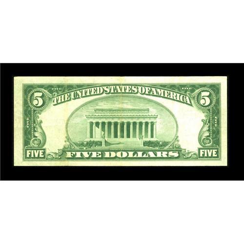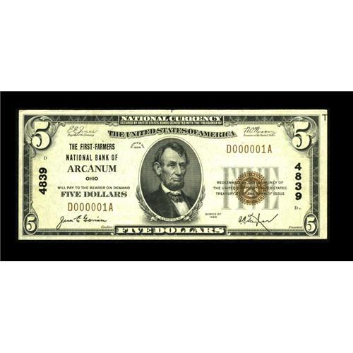 <B>Arcanum, OH</B></I> - $5 1929 Ty. 1 <B>The First-Farmers NB</B></I> Ch. # 4839<BR>In 1928 this institution changed its name to the First-Farmers National Bank after it assumed the Farmers National Bank and their circulation. In addition to its status as being from the first small size #1 sheet issued, it may well be the finest as this <B>Extremely Fine</B></I> was folded in three and never circulated. The embossing is still bold as are the printed details.<BR><BR><b>Shipping:</b> Coins & Currency (<a target="_blank" href="http://www.heritageauctions.com/common/shipping.php">view shipping information</a>)