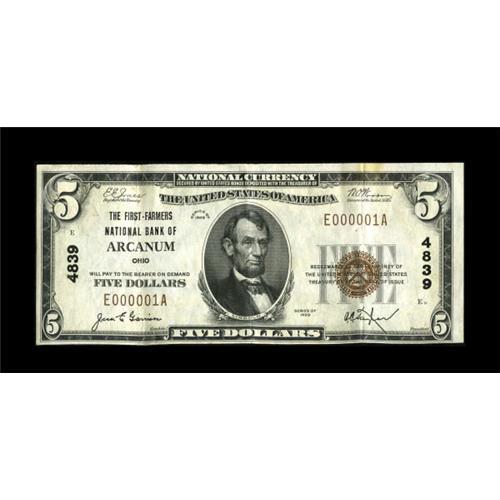 <B>Arcanum, OH</B></I> - $5 1929 Ty. 1 <B>The First-Farmers NB</B></I> Ch. # 4839<BR> This serial number E000001A $5 is the first serial number 1 small size note to show up on this Darke County bank. This example has original paper surfaces and a small, light spot within the top margin. <B>Very Fine-Extremely Fine.</B></I><BR><BR><b>Shipping:</b> Coins & Currency (<a target="_blank" href="http://www.heritageauctions.com/common/shipping.php">view shipping information</a>)