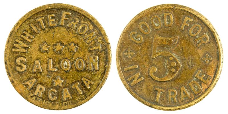Obverse: White Front / Saloon / Arcata. Reverse: Good For / 5c / In Trade