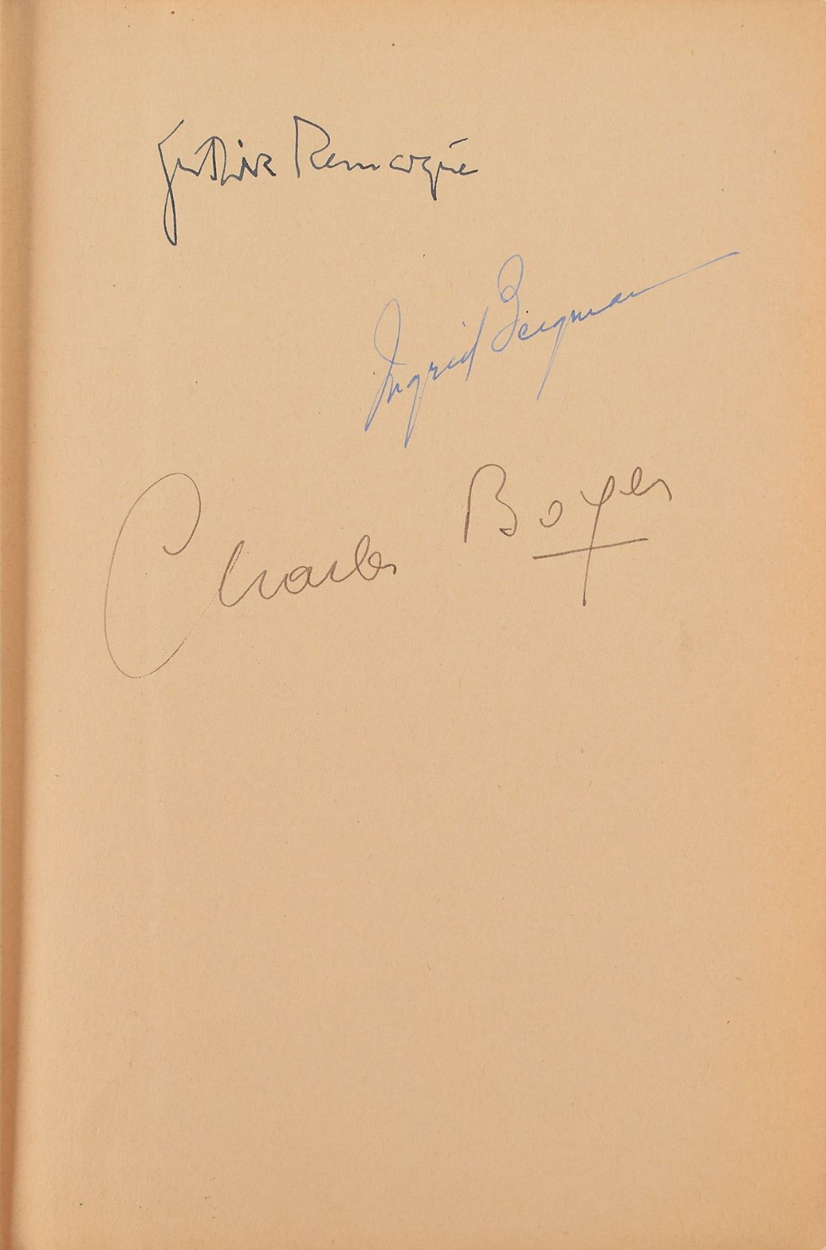 Desirable signed book: Arch of Triumph. First edition. NY: D. Appleton-Century, 1945. Hardcover, 5.5 x 8, 455 pages. Signed on the first free end page in black ink by Erich Maria Remarque, and in fountain pen by Ingrid Bergman and Charles Boyer, the lead stars of the 1948 film adaptation. In very good to fine condition, with wear to the covers and sunning to the spine.