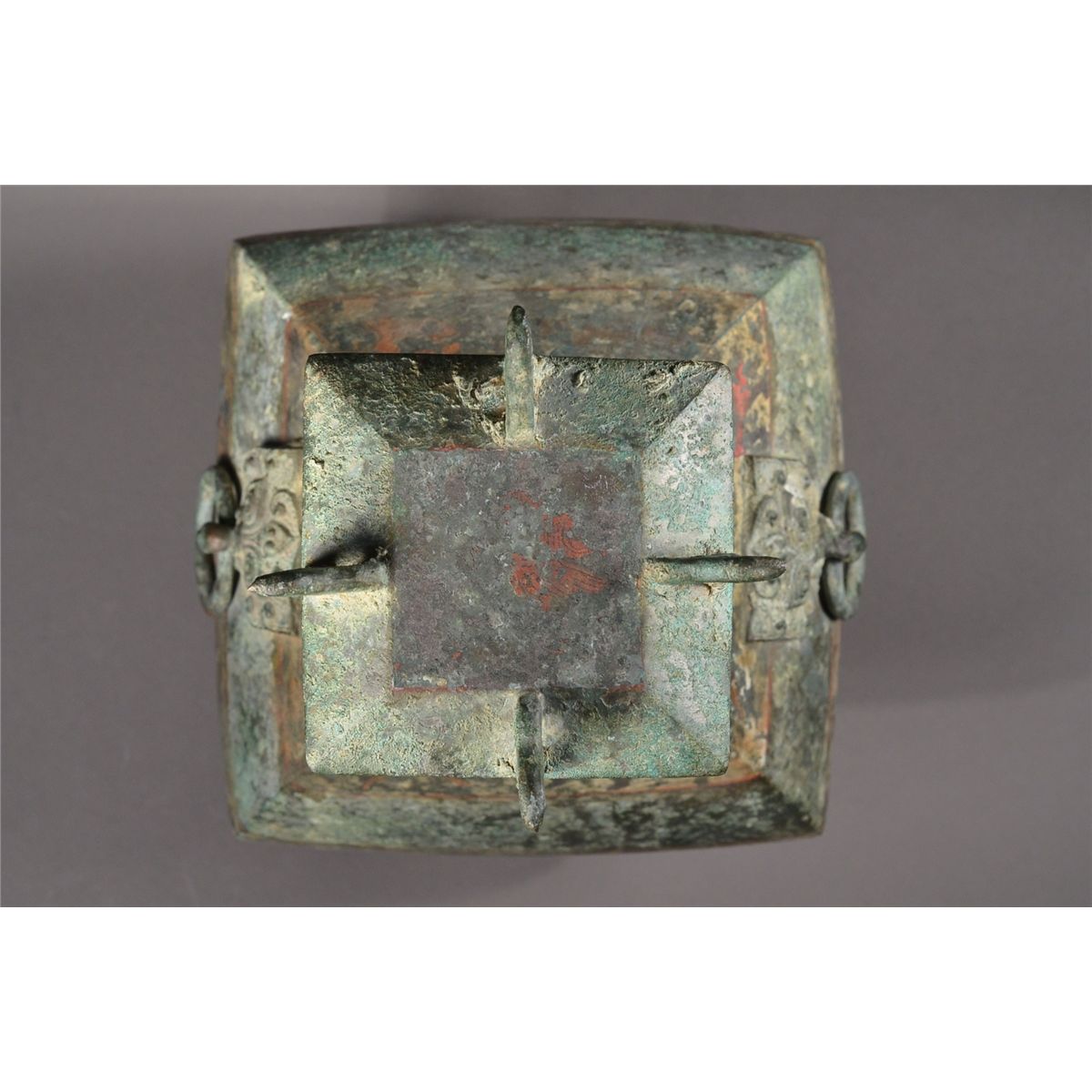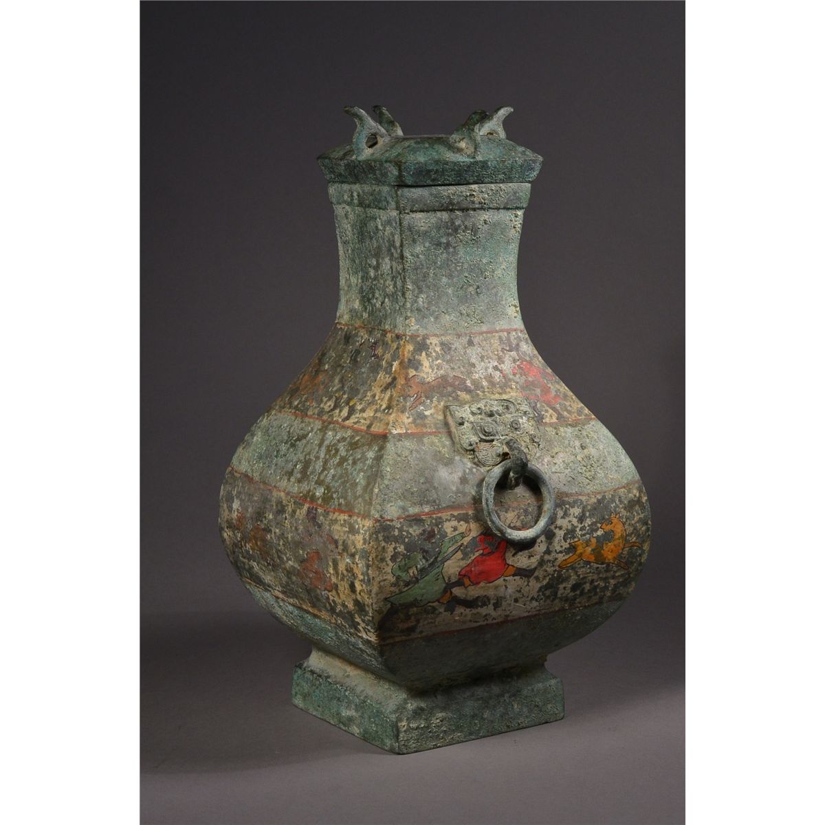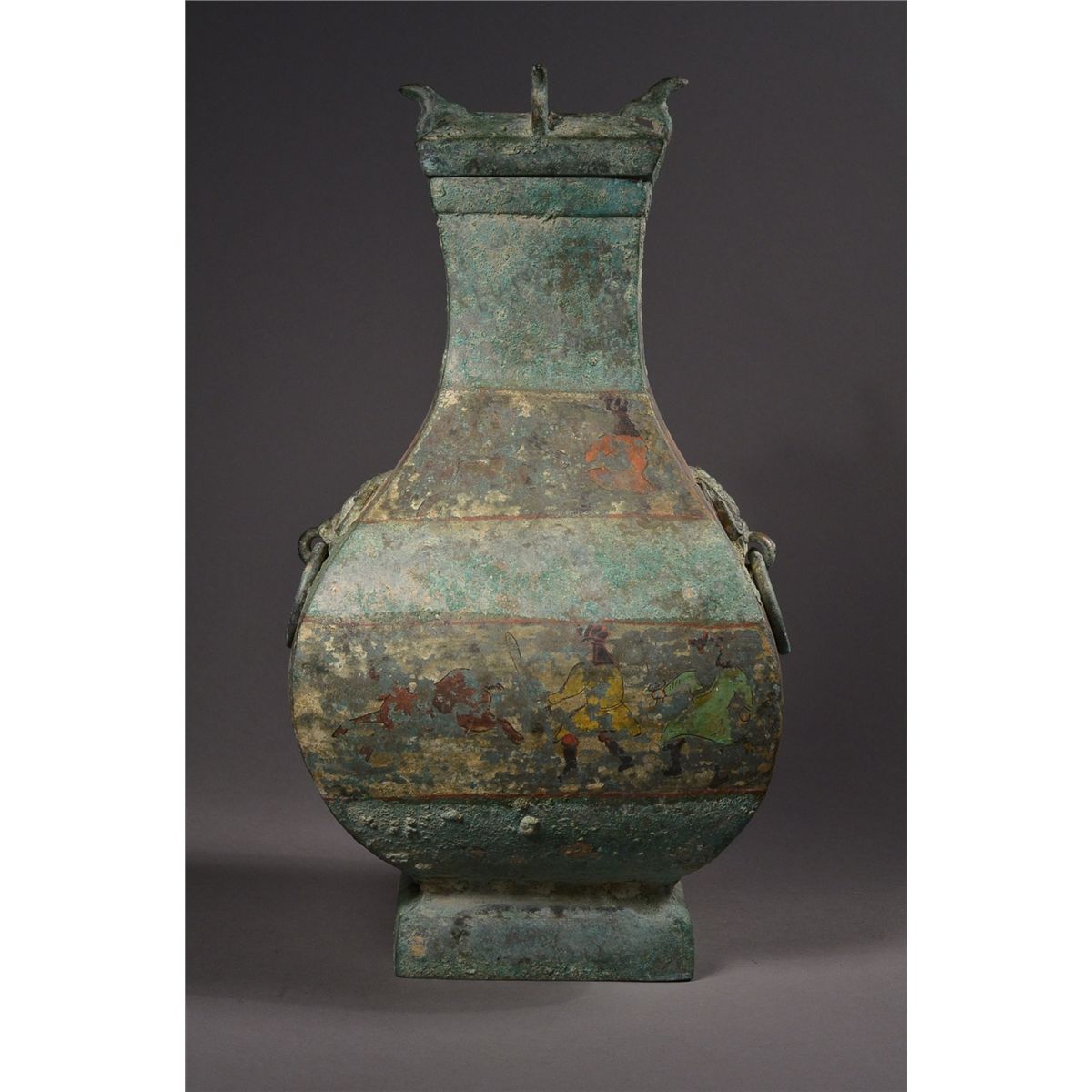 Archaic Chinese bronze hu-shaped square vase; the body with two bands featuring figures in red; taotie mask handles suspending loose rings; turquoise patina; H: 31.75 cm, W: 17 cm, L: 17 cm