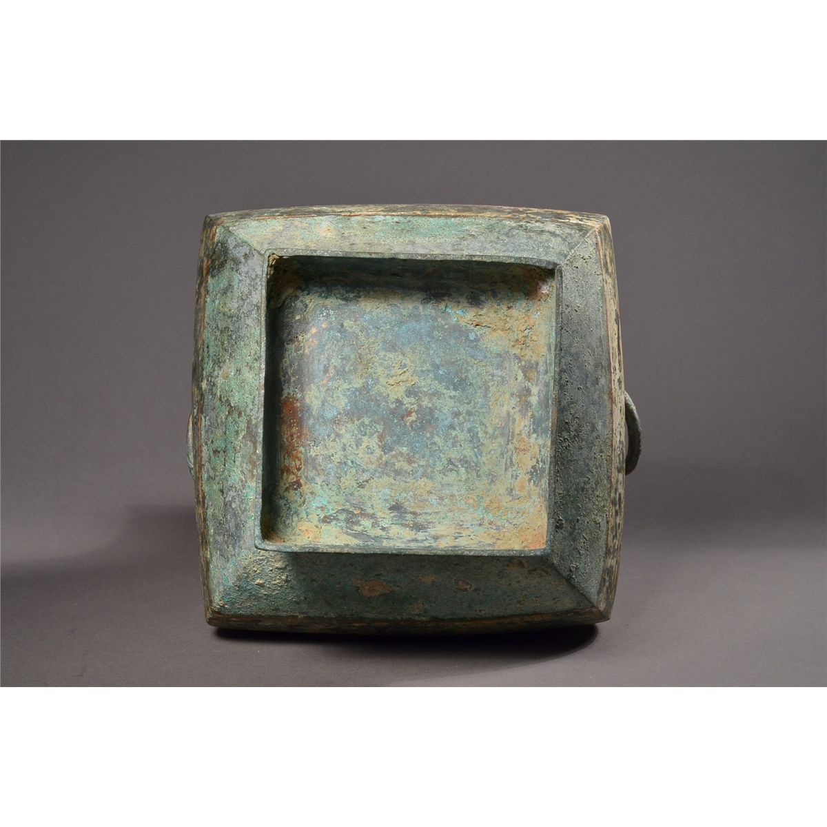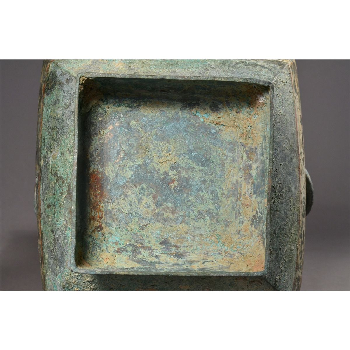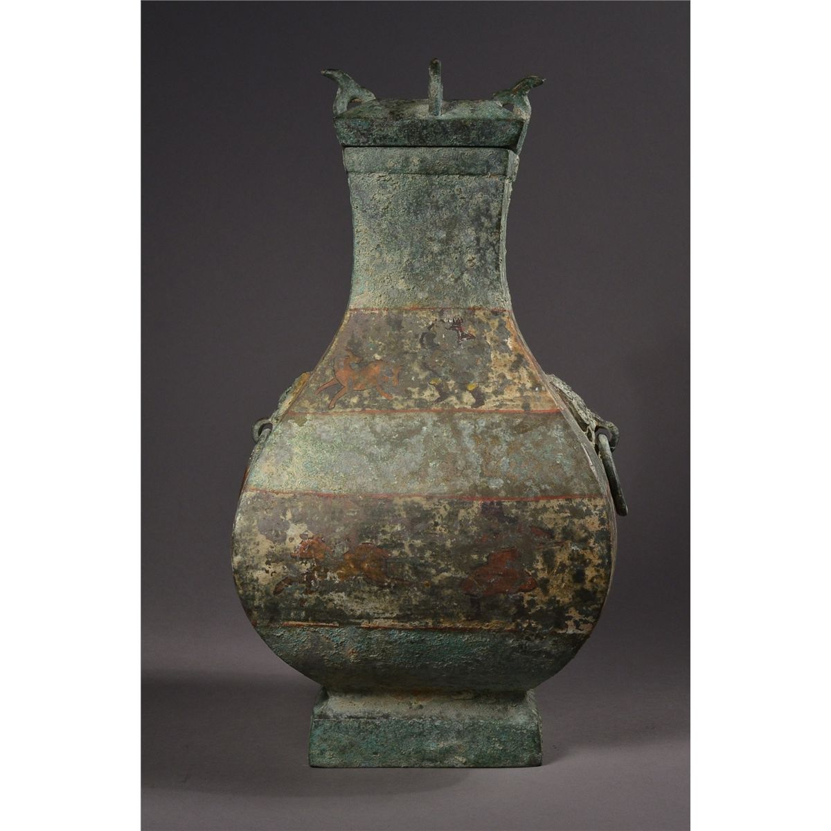 Archaic Chinese bronze hu-shaped square vase; the body with two bands featuring figures in red; taotie mask handles suspending loose rings; turquoise patina; H: 31.75 cm, W: 17 cm, L: 17 cm