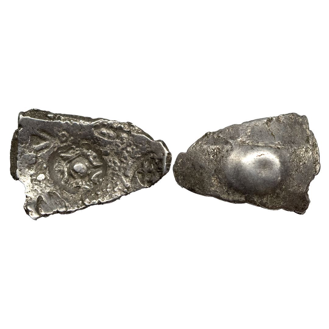 Archaic Coinage, Punch Marked, attributed to Shakya Janapada (c. 600-500 BC.), Kapilavastu Region (Nepal), Scyphate, Silver 5 Shana, 6.44Grms, Narhan type, OBV: A single symbol of pentagon with large central pellet and ancillary symbols as a banker marks, Uniface. (Rajgor # Series 33). Fine+.
