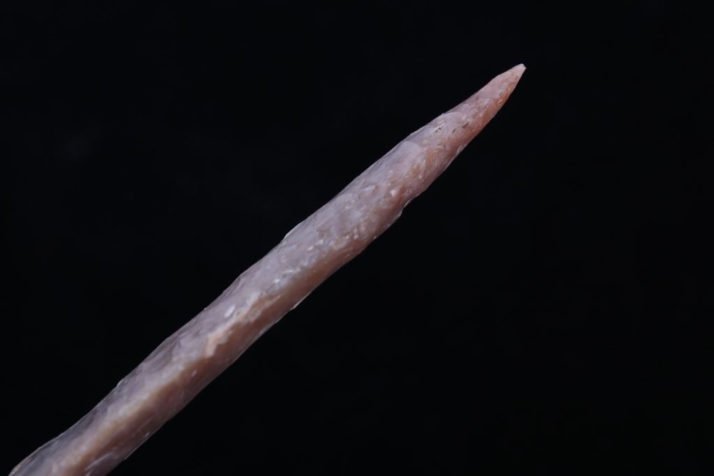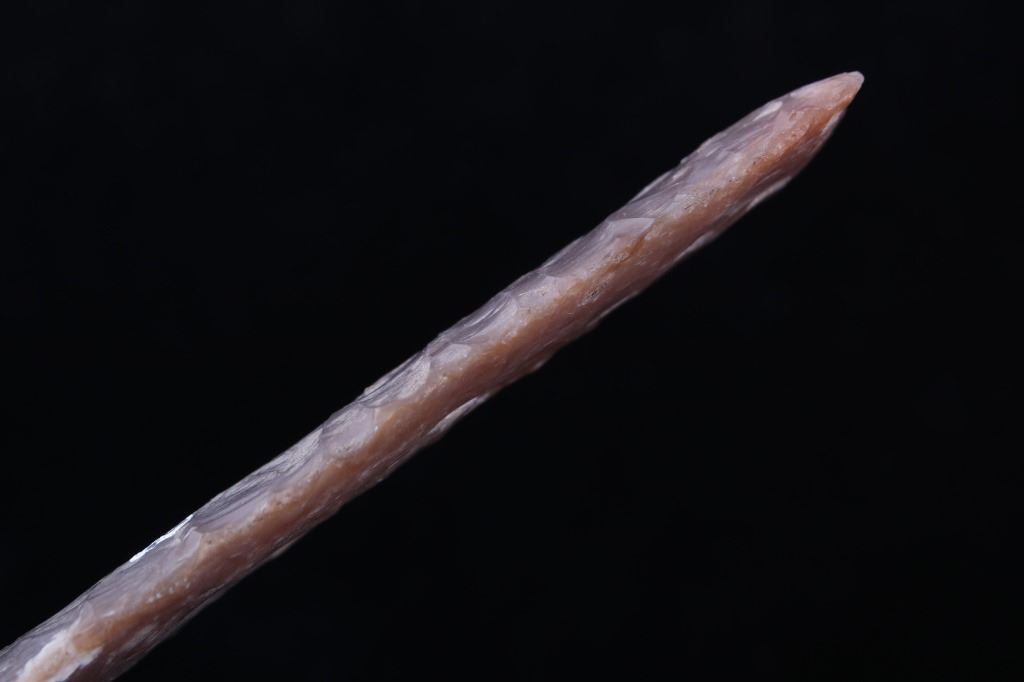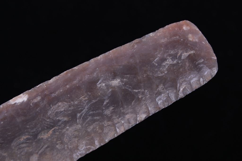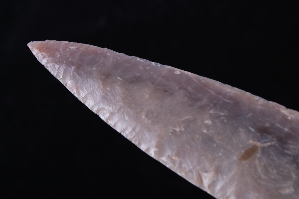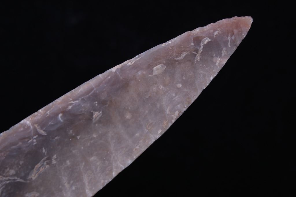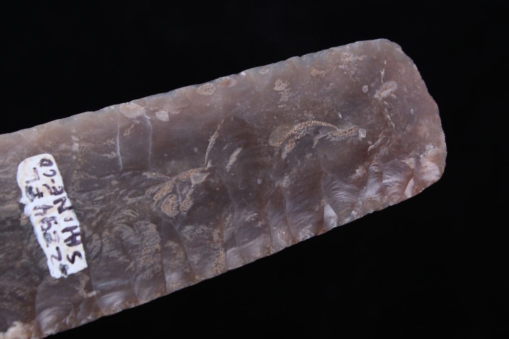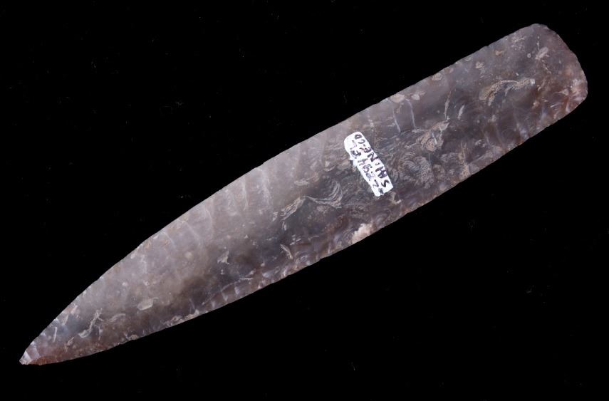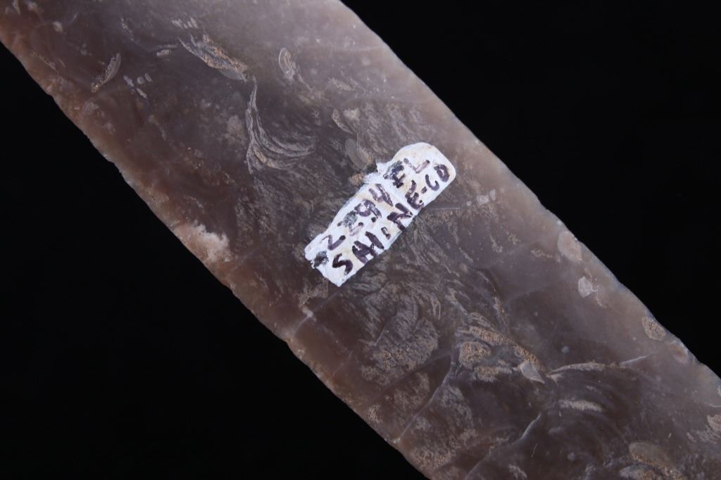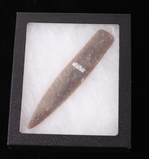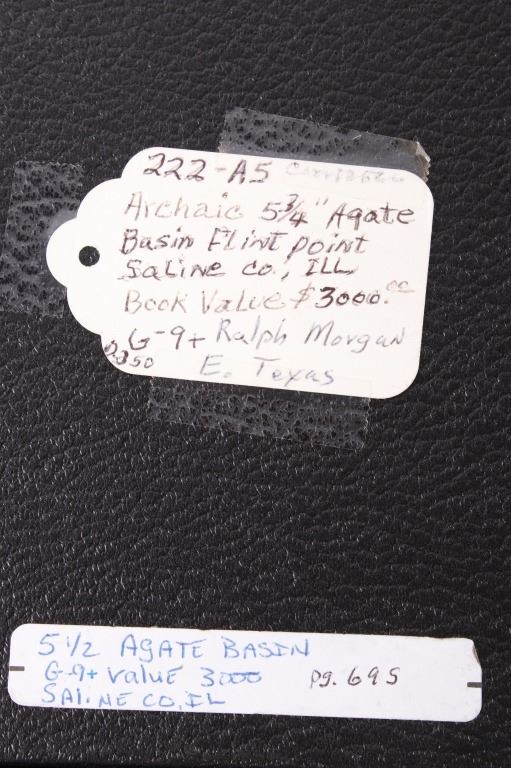 This is an excellent authentic ancient pre-historic Agate Basin long spear point in a rare high grade of G9+. The point shows a wonderful flint material and is in excellent well-preserved museum quality condition which is graded as being a G-9+. This is an authentic original Agate Basin spear point in a very rare large size that was collected in Saline County, Illinois. The spear point has a collection museum tag that reads, “222-A5 Carrizozo Archaic 5 ¾” Agate Basin Flint Point Saline Co., ILL, Book Value $3000.00 G-9+ Ralph Morgan D-350 E. Texas” and “5 ½ AGATE BASIN G-9+ Value 3000 Saline Co. IL pg. 695.” This 10,550-9,350 B.P. artifact is from the Illinois Native American Indians and is an exceptionally fine spear point showing wonderful detail and an extraordinary size. Provenance: From a multi-generation artifact collection spanning 80-100 years from Las Cruzes, New Mexico. The point is in excellent condition and measures 5 3/4” long by 1 1/8” wide. Riker case is 5.25”x6.25” and 1” thick.