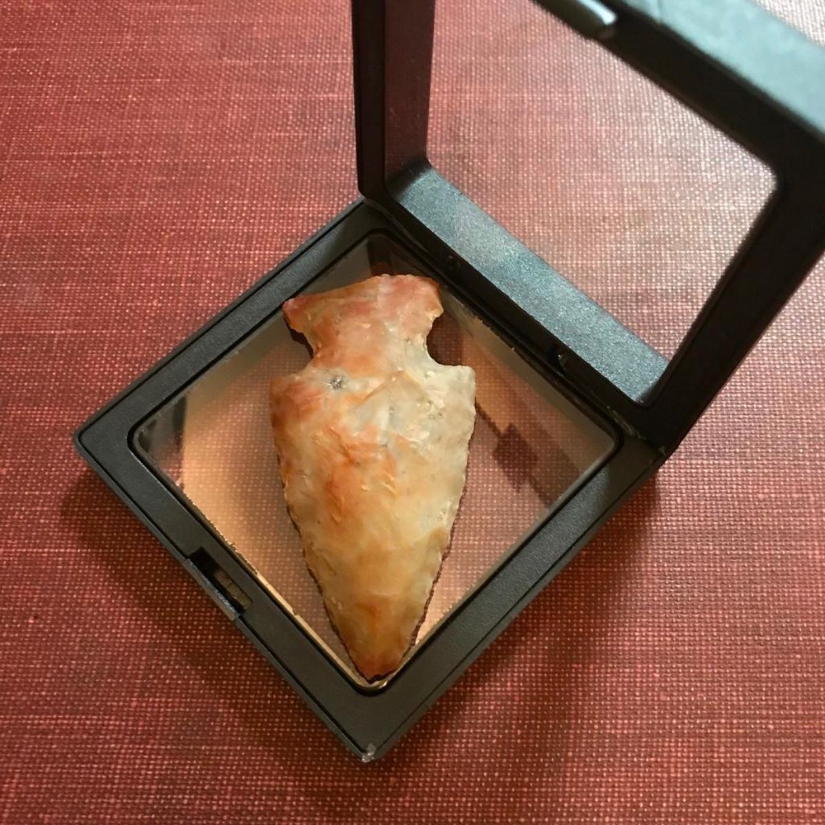 Early Archaic Native American flint arrowhead, projectile point. Big Sandy, large side notch cluster. 10,000 - 8000 B.P. Early Holocene glacial period. 2 1/2" L X 1 3/8". Found at Sorg Farm, Flint Ridge, Ohio May 3, 1974 & marked on reverse side. Comes in small museum style case.Â