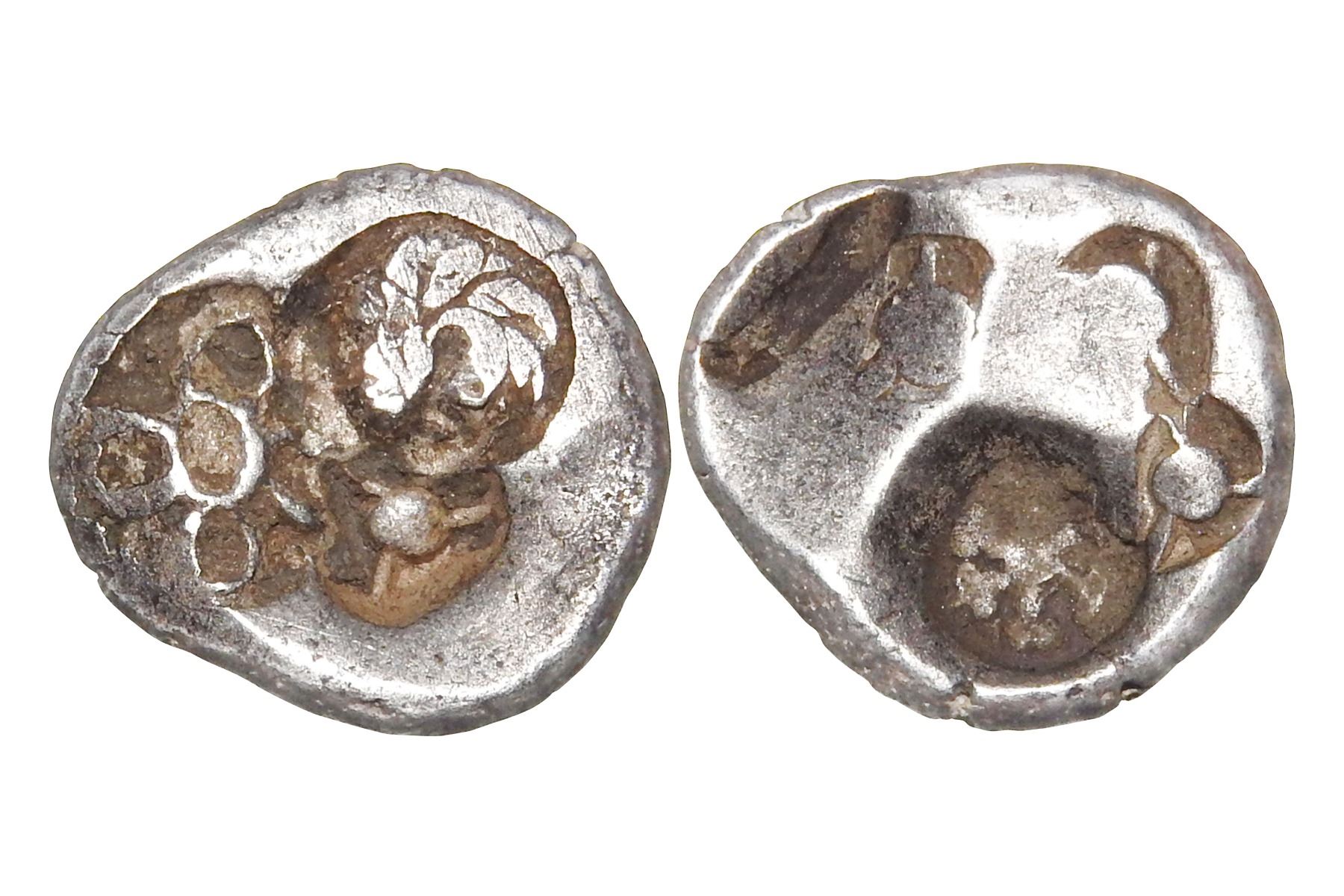 Archaic Silver punch-marked coin, local series from Kaushambi, attributed to the ‘Pauravas’, TH PR1-2 ff., p. 110-112, 2.10 grams. Obv: abstract six-armed symbol partly visible, with small bankers’ marks.