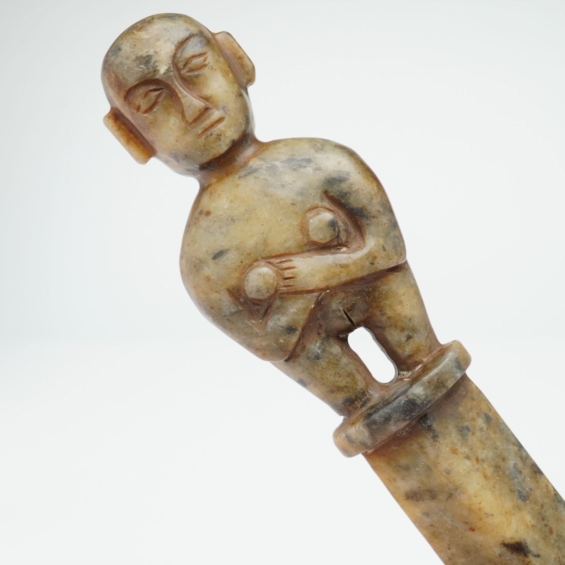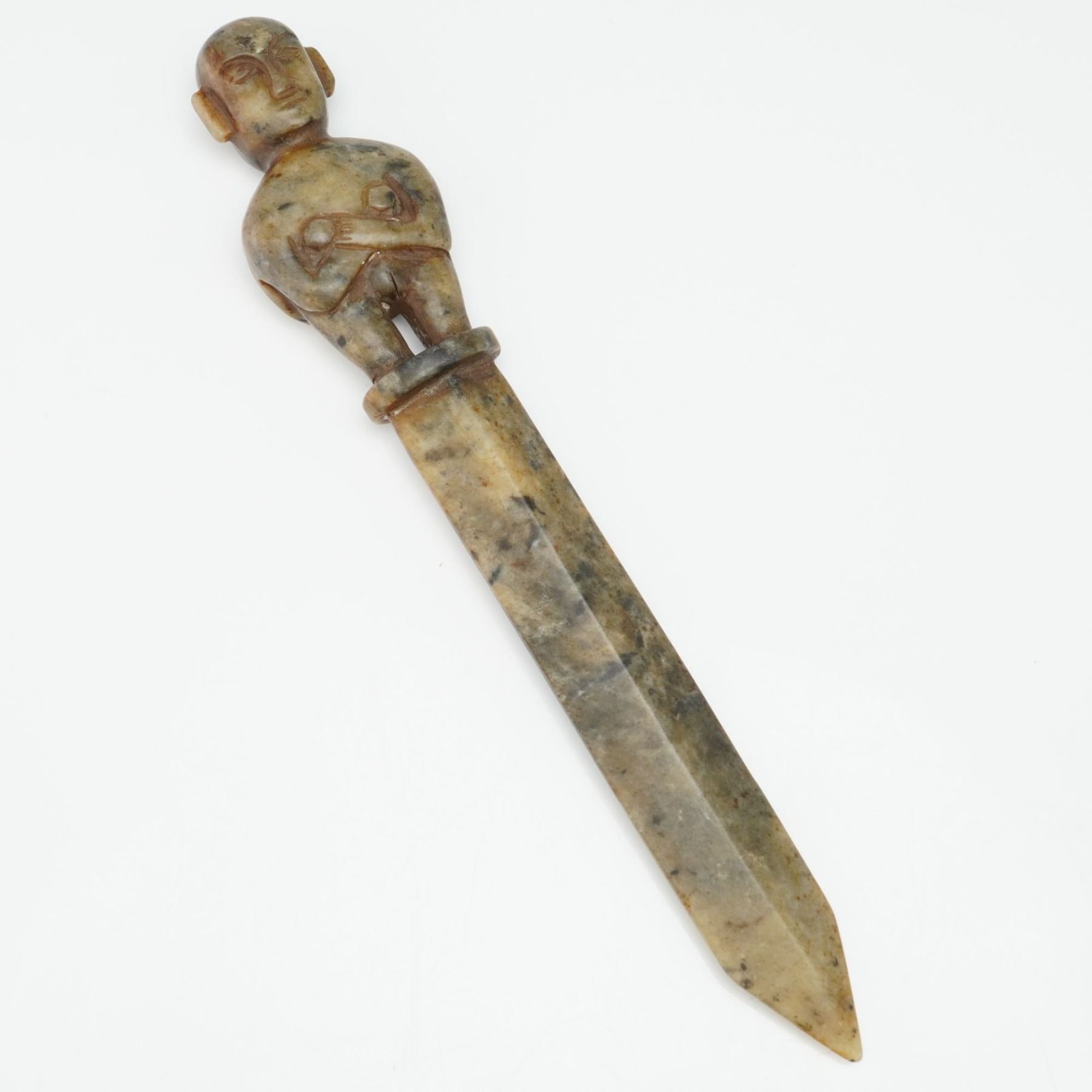 A carved jade decorative blade or letter opener featuring a human like figure hilt, executed in the archaic Chinese. The object is fashioned from a mottled stone with a variegated color palette of celadon green, tan, and gray, featuring dark brown and black inclusions throughout. The handle is carved in the round as a stylized human figure with large, rectangular ears, incised almond-shaped eyes, a broad nose, and hands clasped over the abdomen. A raised, integral collar separates the handle from the flat, double-edged blade, which tapers to a pointed tip with a subtle central ridge. The details of the figure are achieved through a combination of relief carving and incised lines. Provenance: Gianguan Auctions in New York City.