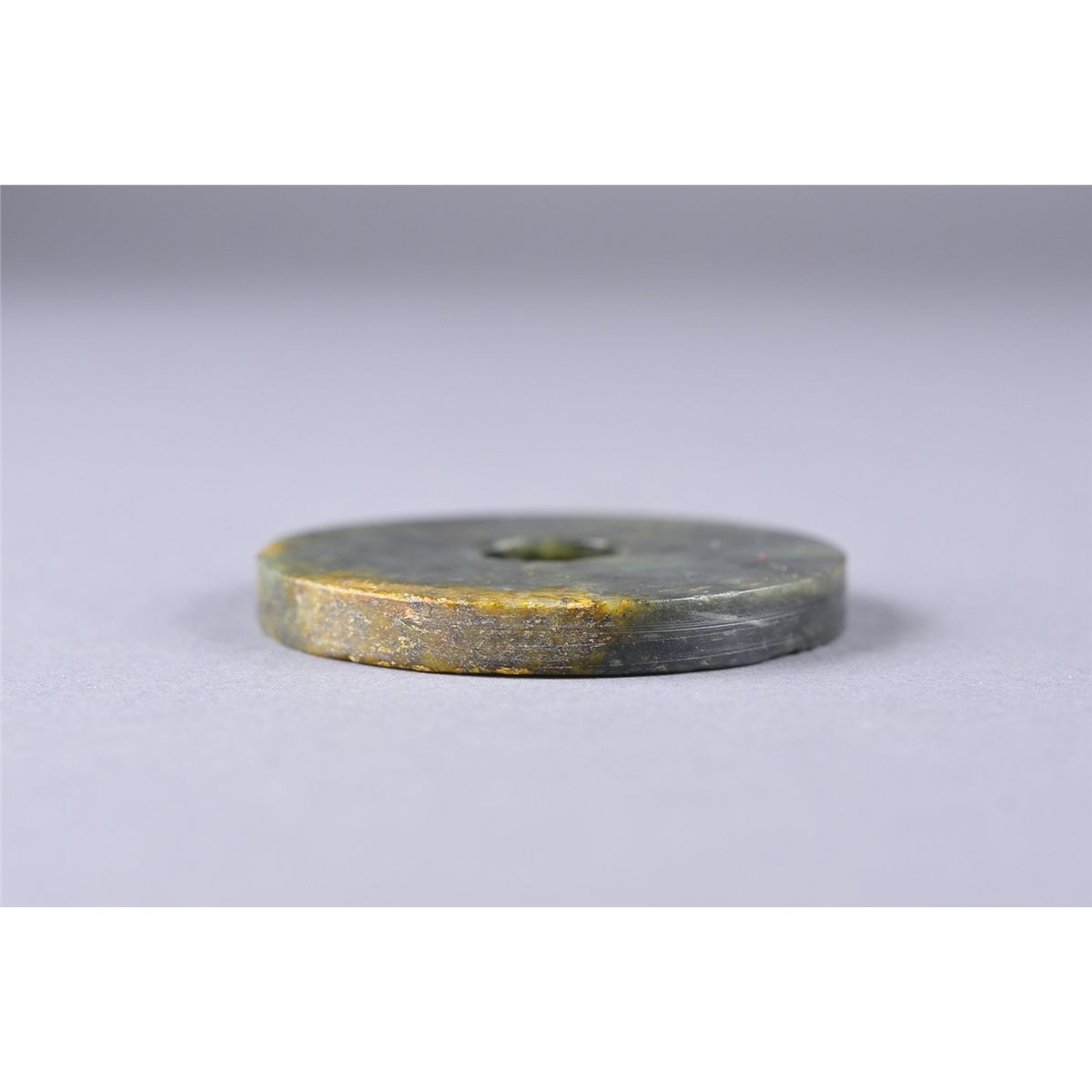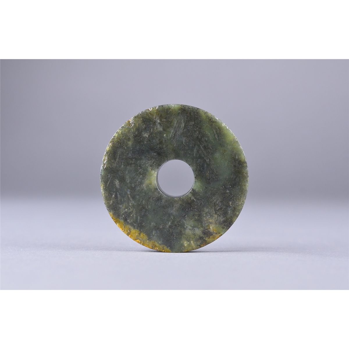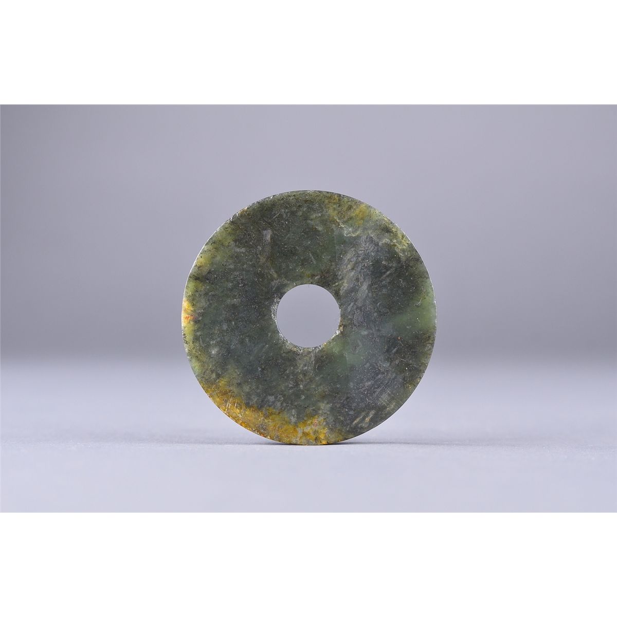 Archaistic Chinese carved jade ritualistic bi disc pendant; the stone of green tone; D: 6.5 cm, 58 grams