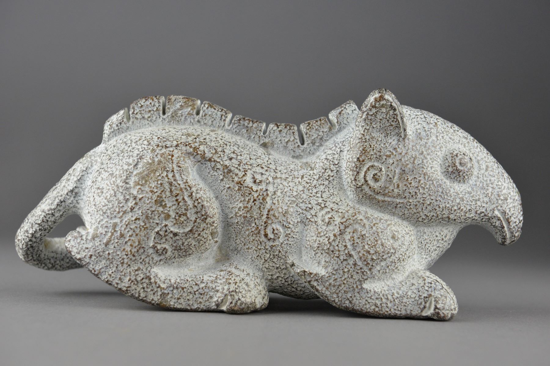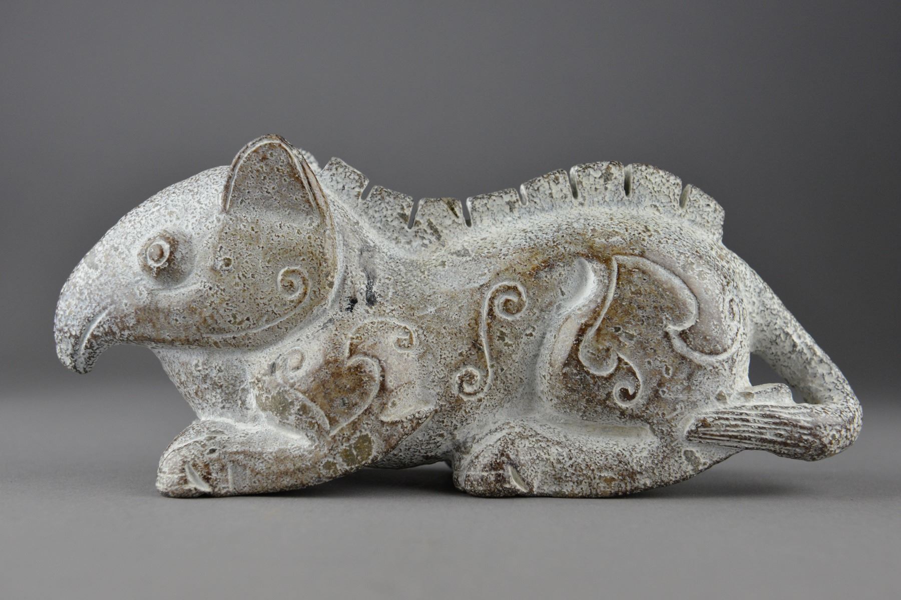 Archaistic Chinese carved jade figure; featuring rodent with archaistic designs in relief on the body; L: 22 cm, H: 9 cm, 1346 grams.