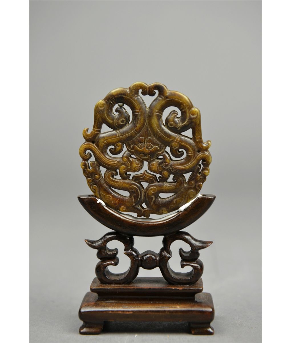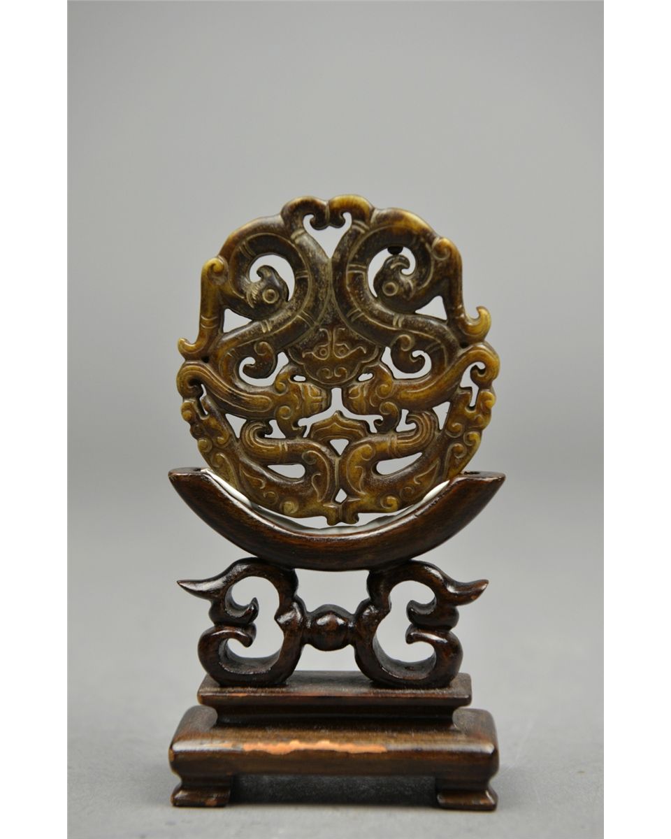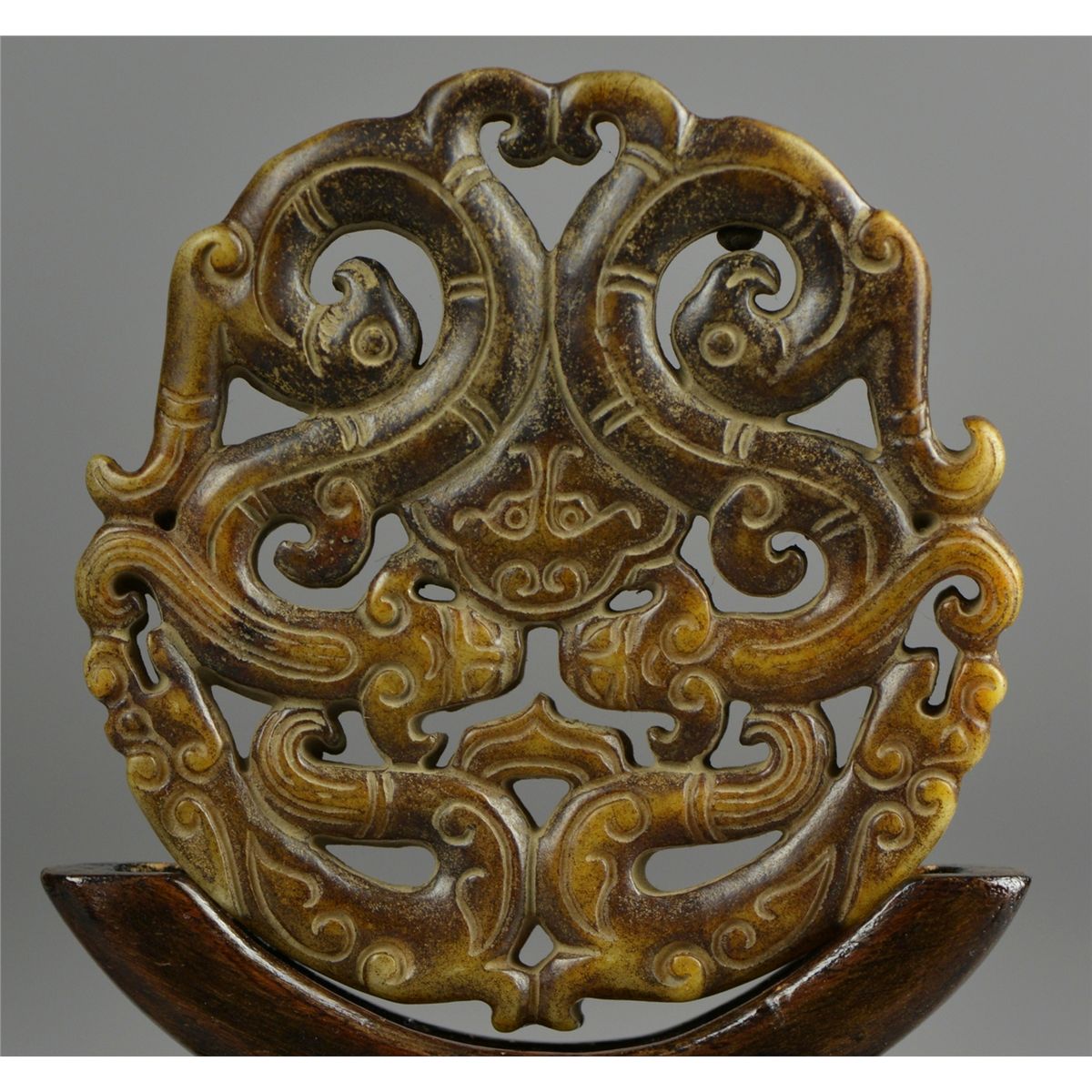 Archaistic Chinese carved jade pendant; circular form featuring antithetical chilong openwork design; the stone of brown tone; D: 6.5 cm, 51 grams. Stand not included.