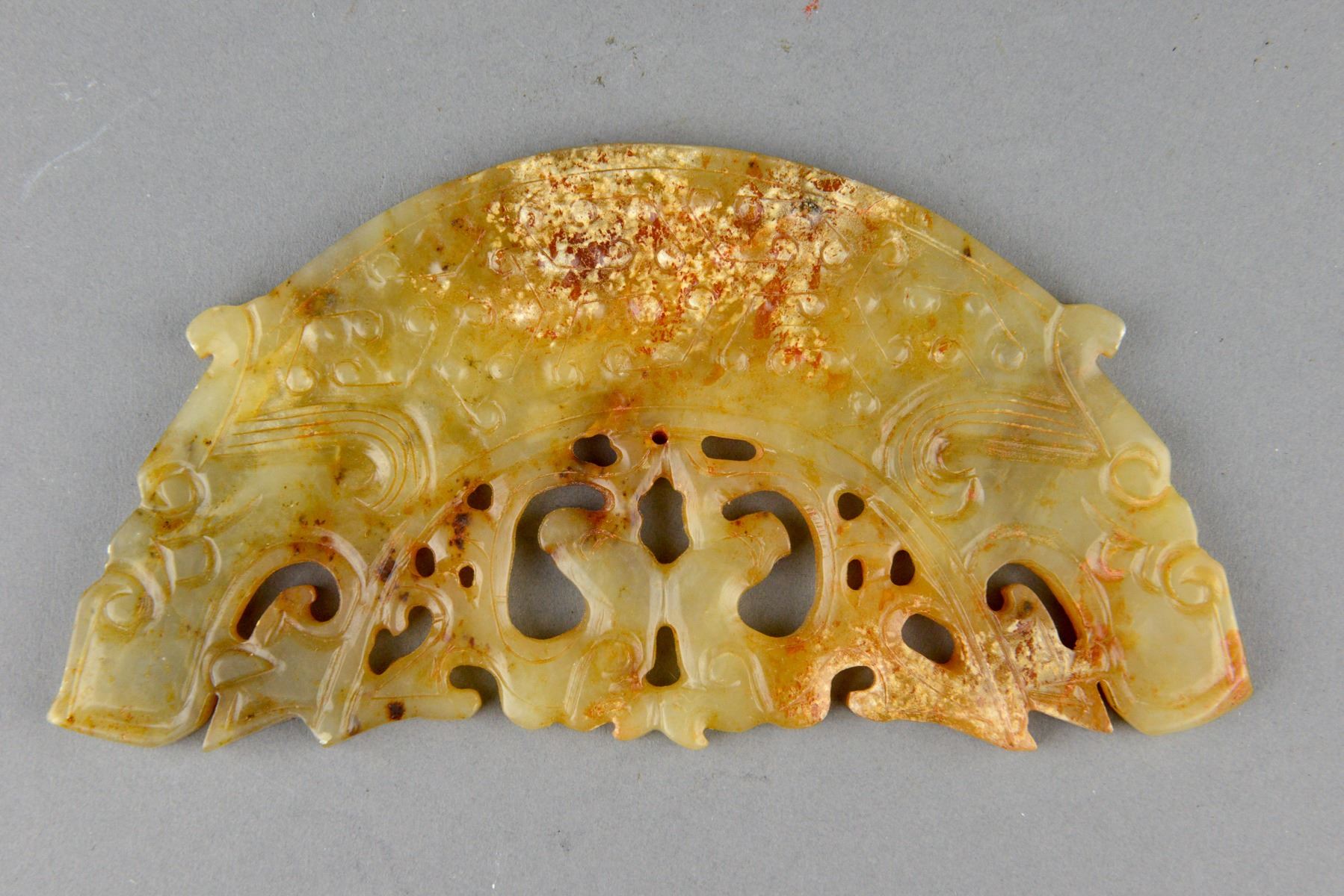 Archaistic Chinese carved jade huang ornamental pendant; in form of opposing dragon heads with raised bosses in the middle in openwork design; the stone of translucent white tone with light brown suffusions throughout; L: 15 cm, W: 8 cm, 129 grams