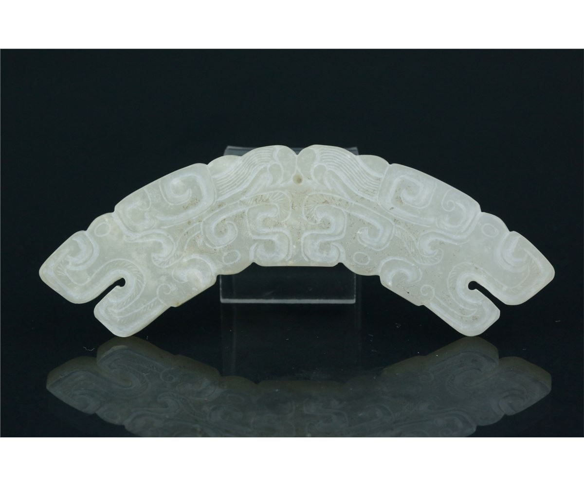 Chinese carved white jade ritual huang ornament; featuring archaistic scrollwork; L: 10 cm, W: 3 cm, 19 grams; Density: 2.94