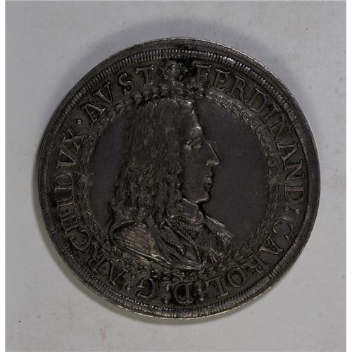 <B>Archduke Ferdinand Charles 2 Taler ND (1654), </B></I>KM984, Davenport 3363A, choice toned XF-AU, beautiful design details. A highly desirable example of this scarcer type.<BR><BR><b>Shipping:</b> Coin/Currency (<a target="_blank" href="http://www.heritageauctions.com/common/shipping.php">view shipping information</a>)